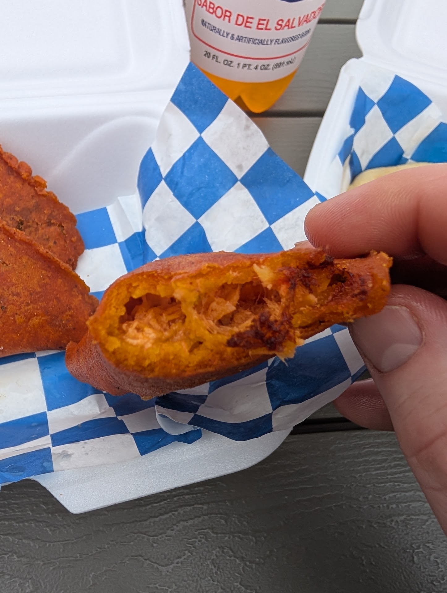 I ordered the 3 pupusas rebueltas and 3 pastelitos (2 potato + 1 chicken). I also grabbed an El Salvadorian soda called Kolashanpan (it tastes like cream soda w/ a hint of banana).
