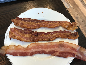 The most recent issue, and the "last straw" which has caused me to reach out to you, was our visit to the East Sunshine location a few days ago (05-10-20). I ordered my regular breakfast, which included bacon. I specifically asked for the bacon to be cooked (not raw) as it had been served the last few times. Despite my request, it was served "raw". I'm not sure how the waitress could miss that, but she did. When I drew that to her attention, she said she would bring me another order, which she did, totally incinerated and inedible (see picture showing incinerated and raw bacon on a plate).