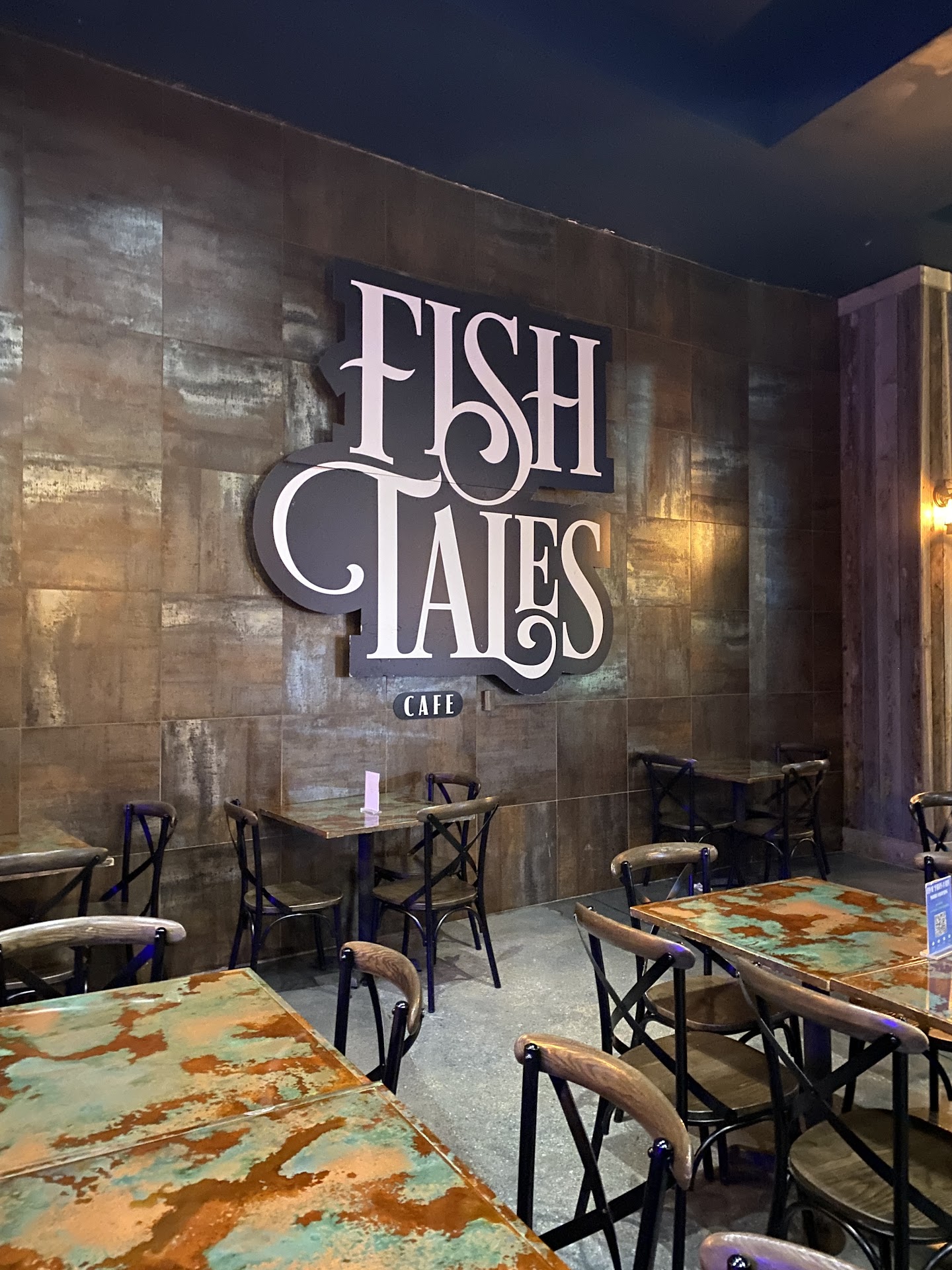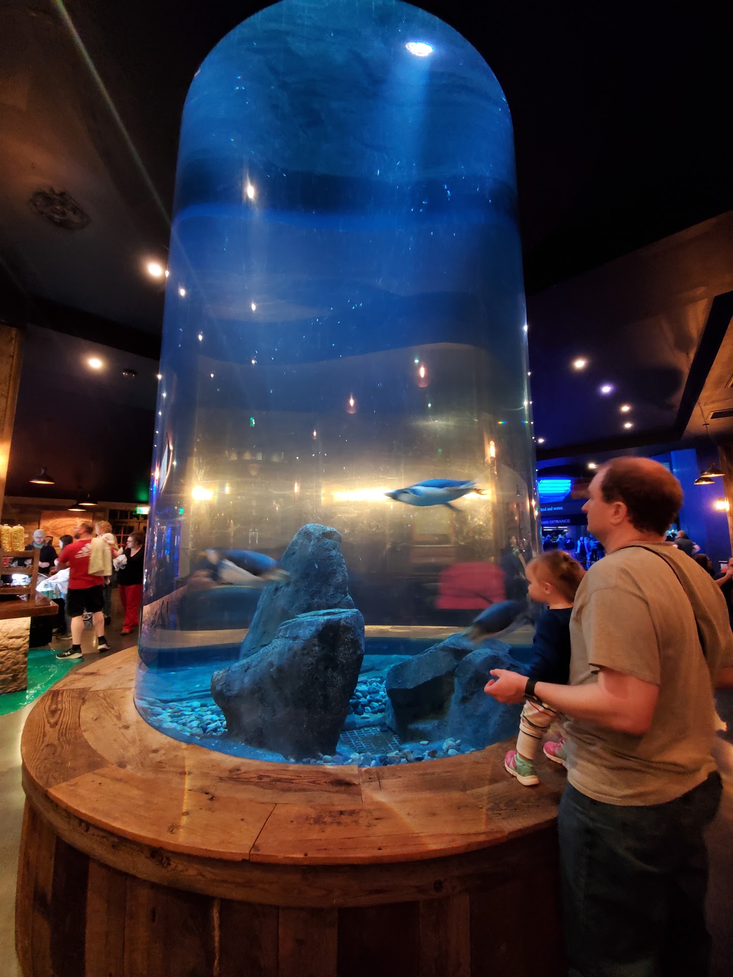 Minimal selections but a quick bite to eat without having to leave the aquarium building. Certainly better than some quick bite aquarium eateries, but not nearly as good as (example) aquarium restaurant in Denver CO. We ordered pizza for us parents. Kids meal for one boy and just goldfish for the other. A TINY BAG of goldfish is like $3!! As is a SMALL bag of chips! WHAT?!?!?! Next time, bring our own snacks and go eat out in the parking lot or something, lol. The kids meal was literally a crustable sandwich (yep, those things you get in the freezer section at walmart), a goldfish tiny bag, a apple sauce cup, and a little plastic cup of juice. It was enough for the kiddo, but probably only if they are 3-7yrs old, otherwise, order a pizza and split it. Our pizza was really good (or we were just starving and willing to eat), but it's like a big wood fired stove and the pizza comes out crisp enough and tasty. Good pizza, pretty quick service, minimal menu options, and fairly...
