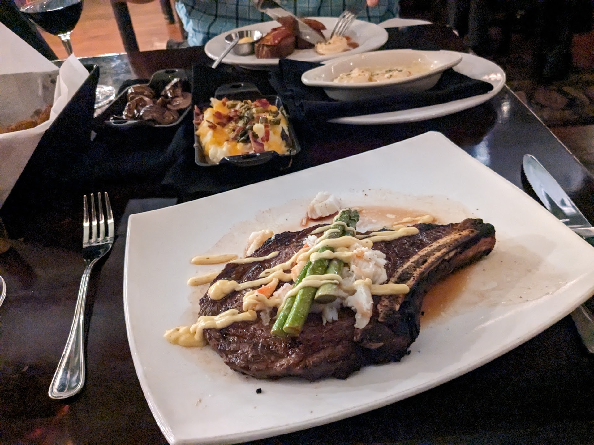 -Food: I am having difficulties with expressing how taken aback I was with the cut of steak I had selected. For starters we can begin with presentation. The steak was presented on a large, but simple, white plate. I think it is to showcase the delicate yet luxuriant nature of the meal you are about to consume. Next was the Lobster Macaroni and cheese, which gave off a rich, yet light aroma. The steak I had ordered was their âDelmonicoâ , which after a brief reading on was essentially a thick-cut rib steak. Definitely an interesting choice to serve such an unknown cut, but nonetheless interesting. My initial cut into the steak was almost fluid-like. I have never cut into a steak that was this soft, yet meaty and smoky in aroma. Oh, the flavor.... my first bite was, in a word: bliss. Well, when I say bliss, itâs that Iâm having a difficult time describing a more superlative term to use when describing the flavor of this steak. If anything, itâs almost criminal that this is being hidden from the rest of the steak world. A steak this exquisite shouldnât be tucked away in a small part of the world such as this. My palate was immediately coated by the richness and meatiness and savory nature of the texture. I couldâve sworn that this was like eating butter. I then tried the Lobster Macaroni and cheese, and once again, the flavors and texture of the lobster and cheese and pasta are so delicately balanced that no bite ever overstayed itâs welcome. The Coca Cola I also ordered was probably the best and most crisp Iâve had in a long time. All in all if youâre ever in Springfield, MO. please donât second guess this place. If youâre strongly considering on patronizing such a place, just do it. I promise you that this place is absolutely worth your time. I only wish I couldâve made a reservation, but all things considered this was by far the best place I have had dinner...