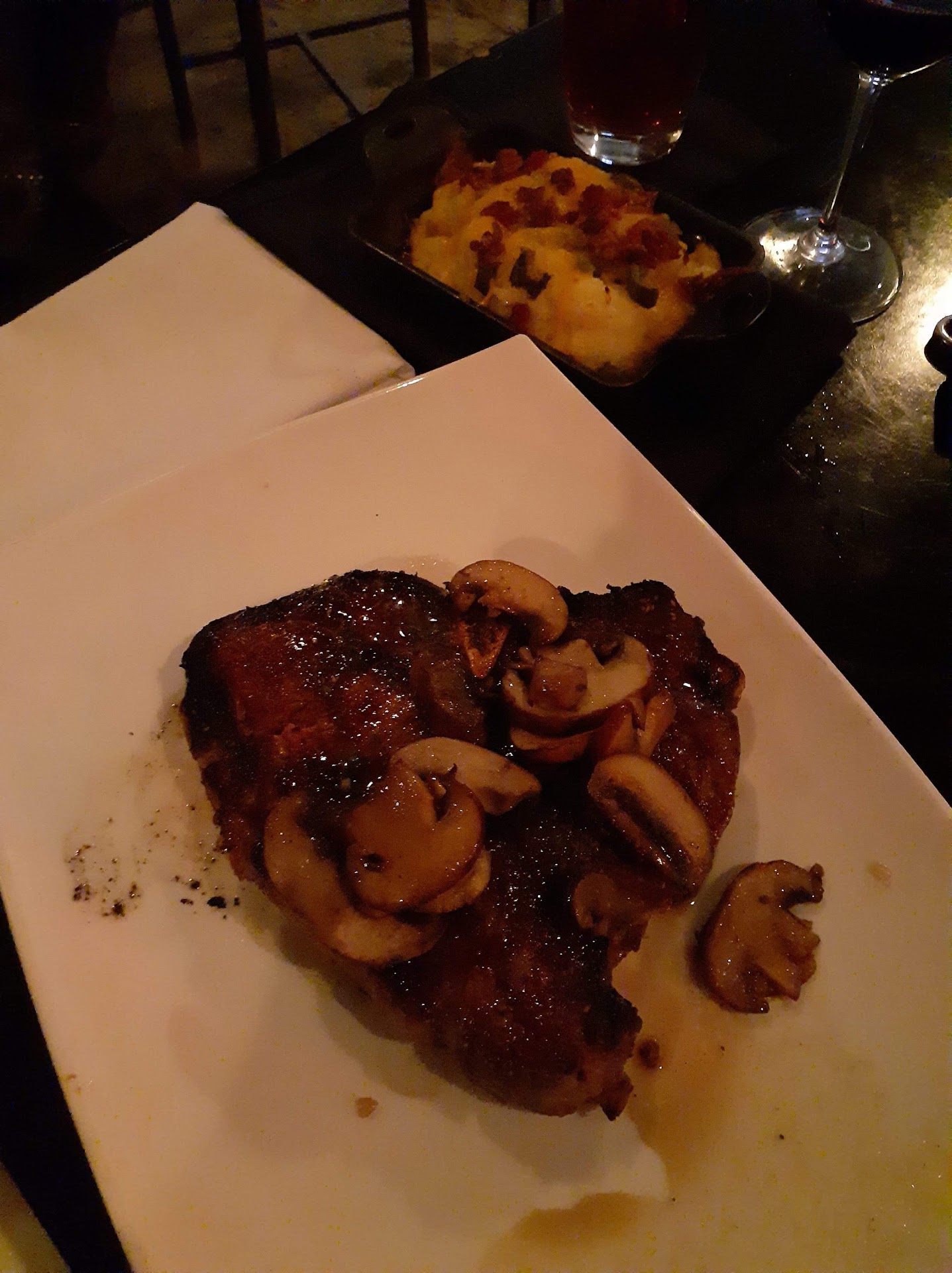 After grabbing the last seat on the bar, I was promptly welcomed by the bartender and given a menu. It is a single double-sided sheet (available on their website), and in keeping with the gourmet theme, has fewer options than something like a chain restaurant. I selected the 14oz ribeye steak (medium-rare, advertised 25-day wet aged and 21-day dry aged) with lyonnaise potatoes, a choice that was praised by a fellow bar patron.