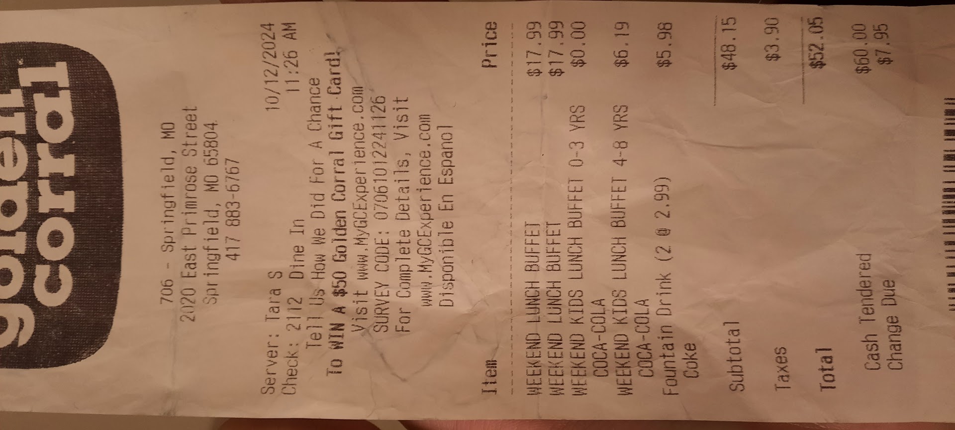 Thinking that it was on the southern end of town, we thought this would be the better one. Now I'm sure that Covid has impacted their business/staffing etc. But to show up for breakfast and to have little to no food out on the buffet is unacceptable. Clearly I observed new hires being trained. However, there wasn't really any observable Manager running the things. No plates, no syrup, pancakes and waffles that were hardening up. No breakfast meats except bacon. Just a very poor showing all together. I get its Buffet food so I wasn't expecting high end cuisine, i also wasn't expecting a buffet that was 70% empty and what food was available was old. Restaurants already faced an uphill battle prior to Covid, these folks better figure this out or they will be like many other Golden Corrals that have closed post-pandemic. Updated 3/30/24. Addition by subtraction, now that Springfield has 1 location, the location was busier, staff was more attentive and food was much better. Went for breakfast the Saturday prior to Easter and with the exception of the girl. At the register, the entire staff was friendly and attentive. If you're craving an omelette, make sure you get one made they have plenty of ingredients to make specifically how you like. This was by far the best Golden Corral visit AT ANY location...