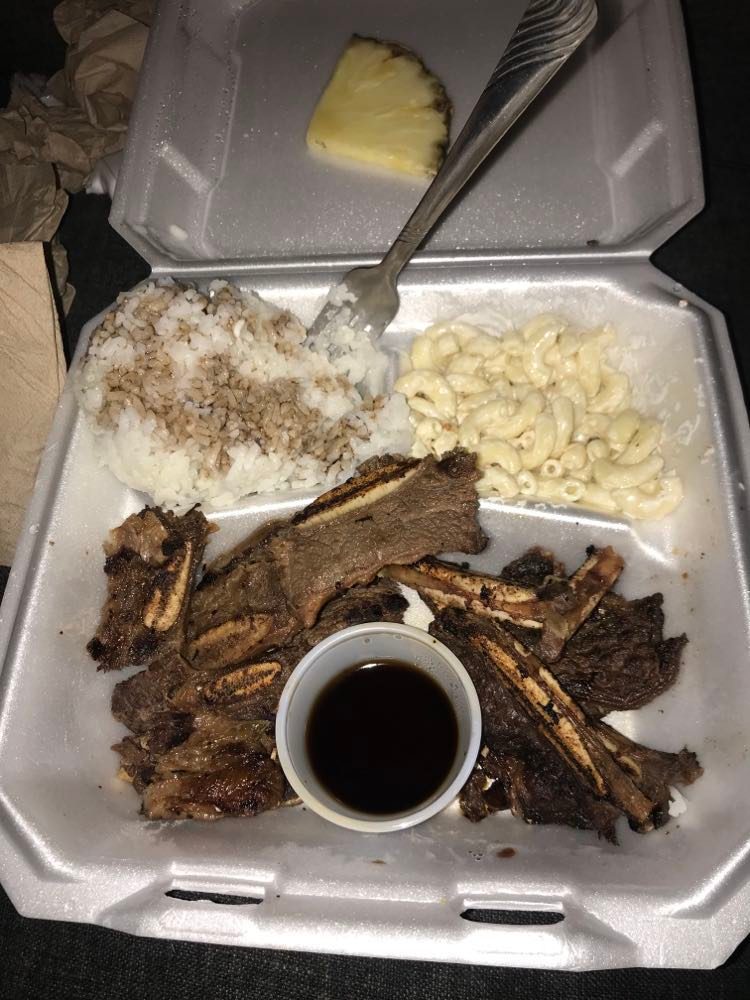 Had to use my own bottle of Mr Stubbs Mesquite BBQ Sauce to give it flavor. The Noodles my partner had were good, about as good as any Thai place. But these ribs were not at all like what I know Hawaiian BBQ to be in any way. Where's the...