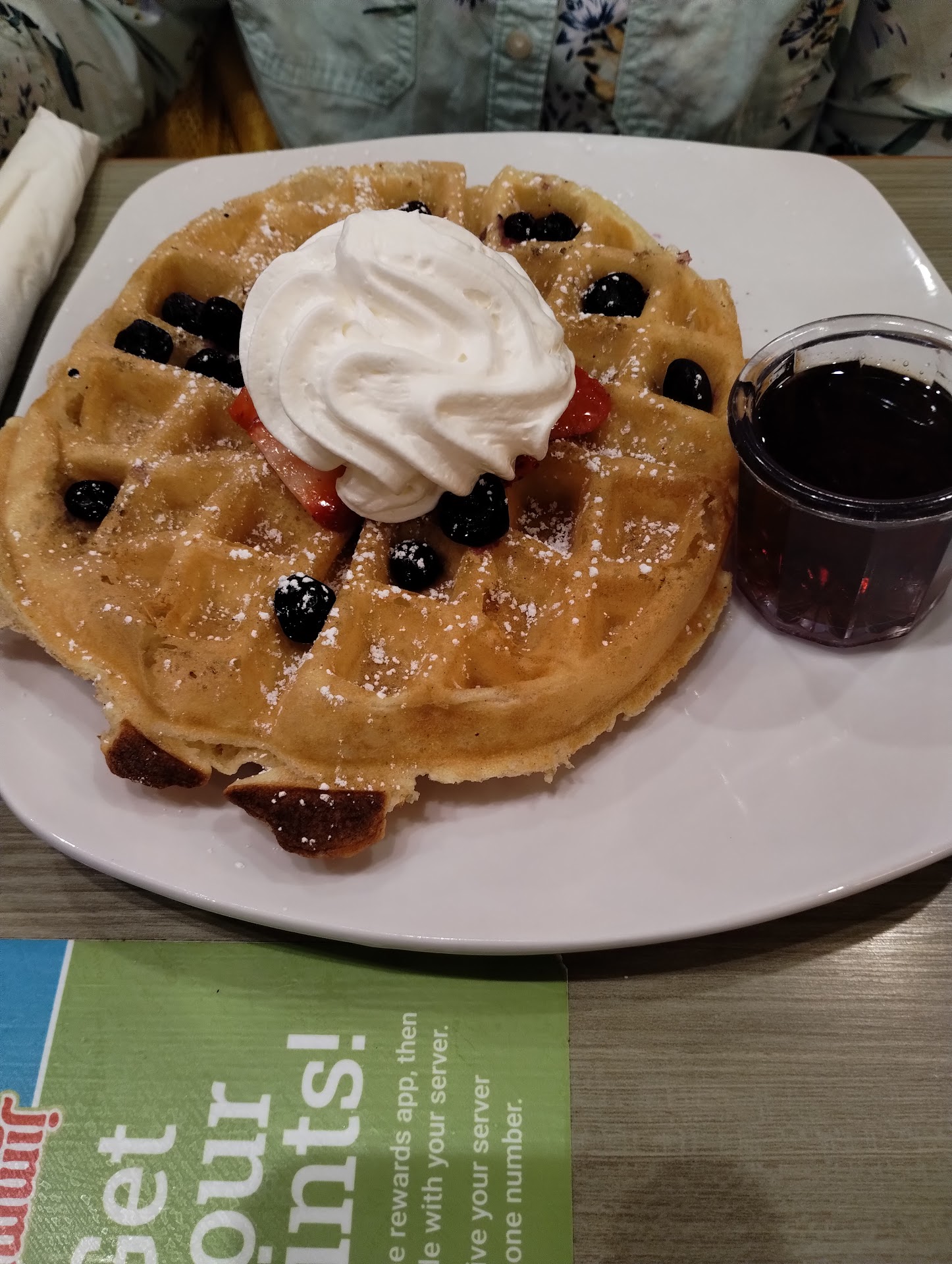 Read moreWe live several hours away. Everyday we are hammered with their commercials of the delicious looking food. I won't lie we arrived with expectations from all those food images and commercials. We knew what we wanted without opening the menu and pointing at the pictures on the cover. I don't mind spending money getting what I see. Even though presentation is important, quantity is just as important. I feel my wife's fresh Fruit toppings were coming up short. My club was fine. It bothers me though when I see disappointment in my wife's eye. Especially when Bobbi set her waffle on the table. Will share the menu image and her waffle. Bobbi never did ask about her waffle. Only about the sandwich and focusing on it in conversation. Sure she overheard and saw me next table over while pointing to the image and sharing my disappointment to her of the waffle on the menu. What I thought was special. Was anything but. I can get anything but, back home. Pictures say it all. To clarify. There is no pile of strawberries under the whip...