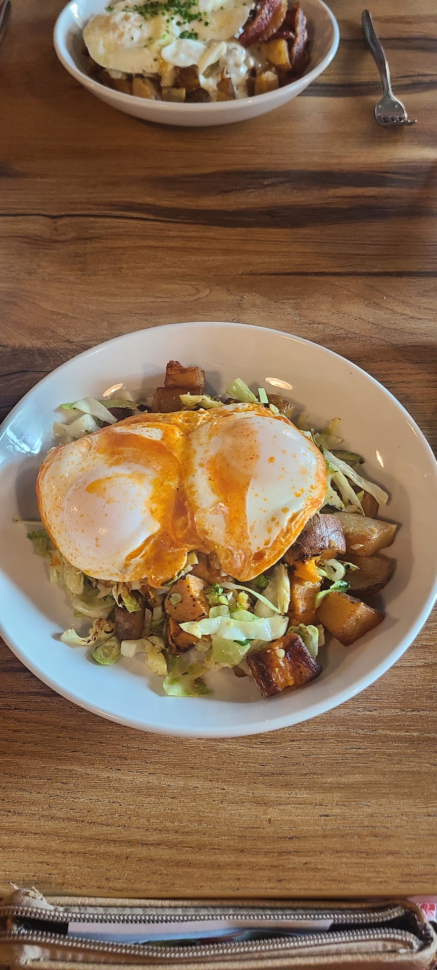 The atmosphere as compared to what we enjoy at Gastropub left something to be desired, and as a standalone (i.e., not in comparison), it was just another breakfast spot without much personality. The hostess wasn't unfriendly but she wasn't very friendly either. Our server was kind of in the same mood but she was enthusiastic and super sweet to compliment my ensamble which made me feel great about myself. I was having one of "those" days and though she didn't know it, she helped boost my mood. But after the clothes chatter she returned to being busy and aloof. I chalked it up to how busy the restaurant was. It was great to see Tyler, Springfield's best bartender and on our way out, Andy the owner thanked us for coming in and wished us a nice day.