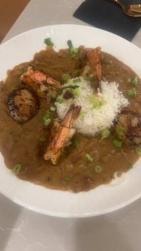 Then, we had the seafood Étouffée. The shrimp was a bit overcooked. The sauce was wayyy too salty. The rice was tough. The scallops were great though!