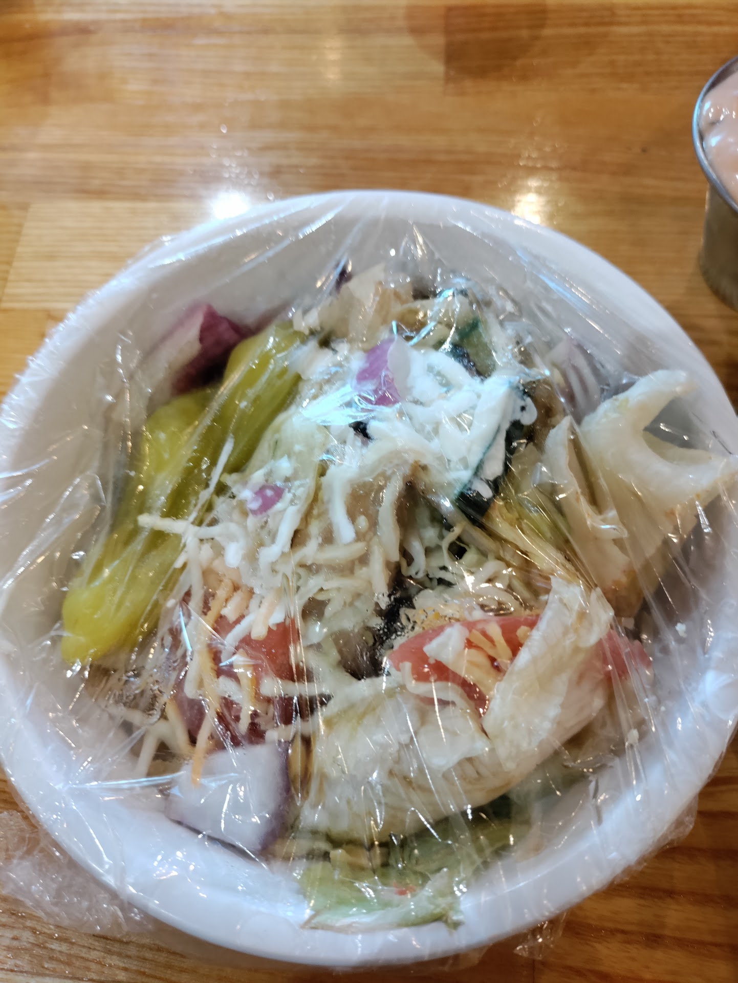 I also ordered a side salad without asking or looking on what’s inside . Iceberg lettuce, tomato, onion, cucumbers and lots of them , cheese and a pepperoncini and saltines . For $5 it’s a decent salad . I don’t usually eat cucumbers, but I suffered thru it. They were actually decent tasting .