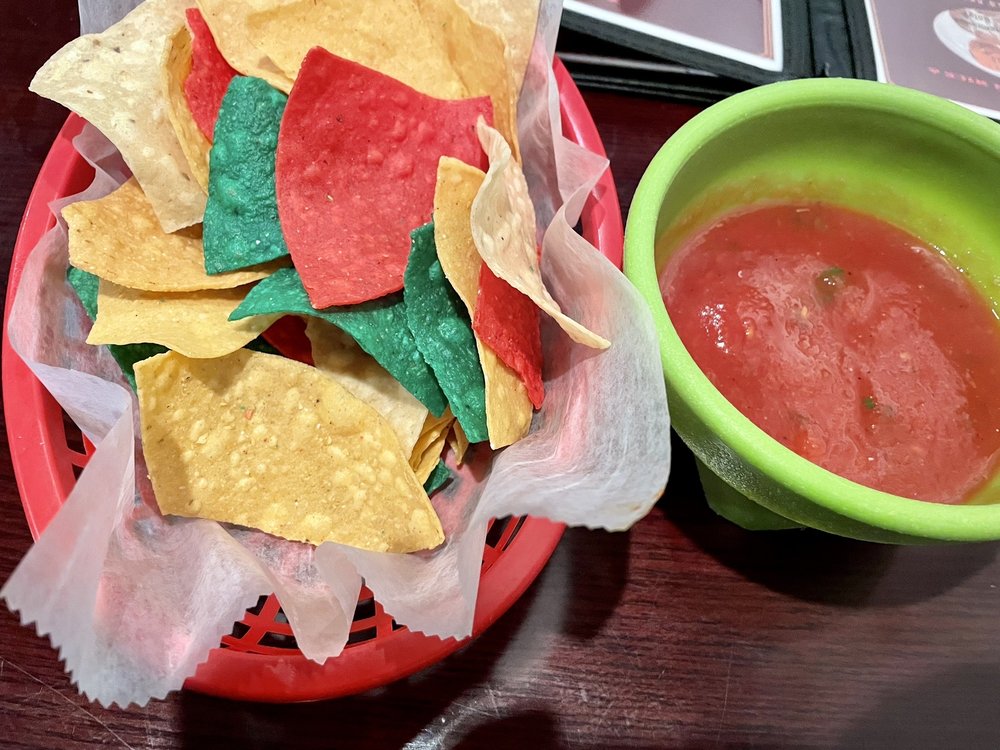 Chips and Salsa: they serve very colorful tortilla chips. They were light and crisp. They serve a mild salsa which had a very good taste. I asked about a spicy salsa and they brought one out that looked the same as the mild. Believe me, looks can be deceiving. This one had a burn.
