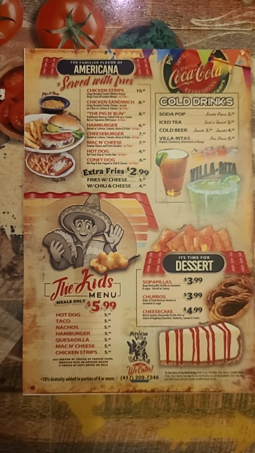 Read moreDear Lord, I can't even tell you how much I love this place!!!! My husband and I ate here all the time in college and it has become our all time favorite place to eat in Springfield. We never get tired of it......ever! Never, ever, have we had a bad experience nor have we ever been disappointed with our food, it's hot and perfect every time. Service is always good, the food comes out quickly and it's just an enjoyable experience. We love the atmosphere, they did a little remodeling in the back section a few years ago, it's just comfy and inviting. I still look around the room at all the decorations and old photos as if I was there for the first time lol. Mexican Villa feels homey to me, and I always leave satisfied! The tacos are a favorite with my husband and kiddos, I always get the sancho enchilada style and the YELLOW queso is a must (it's the original). They have a hot salsa, which I love, then they have a mild, which is a nice chunky salsa, then there's the sweet, which is a smooth salsa. They're great individually or mix them to create the perfect combo, either way, they're all winners! And, it's available to purchase so you can take that goodness home with you! There are multiple Mexican Villa locations, our favorite spot is the "campus" location, or National location. We've been to each of them over the years and they're all great, but campus has just always been our "home base" so to speak. If you're local, you already know what I'm talking about, if you're visiting Springfield or just passing through, STOP HERE!!! Trust me,...