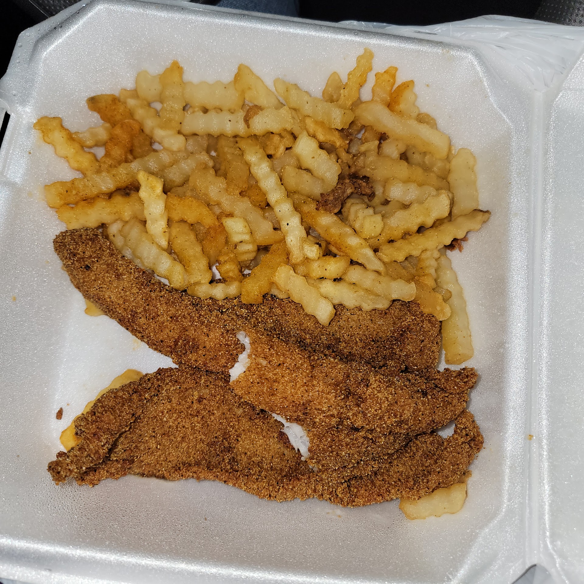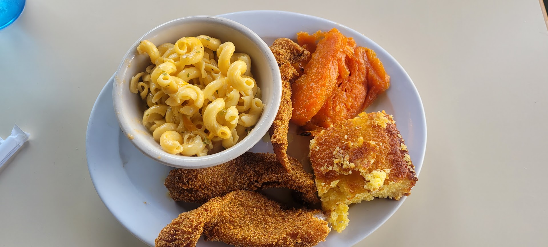 It's hard to give it 3 stars for food because the fish was awesome! My husband and I got the 8 piece family meal with 2 sides collard greens and Mac and cheese. My brother and his girlfriend eventually got fish. She ordered fish and yams with Mac and cheese and my brother originally ordered a Philly cheese sandwich but they didn't have the steak so they asked him if it was alright to substitute for chicken and he said yes. They also told us they didn't have the dessert biscuits all after we had paid for everything, but they agreed to substitute the biscuits for cornbread. Then as we were waiting they said they didn't have chicken either and my brother had to change his order again. So he ended up with fish and fries. When we got our meals I noticed our family portion of sides was in the same size bowl as the single order my brothers gf ordered. I also had to ask for extra plates to divide the family meal with my husband. The fish was great, the collard greens were great and the cornbread was wonderful! But the Mac and cheese was just seasoned noodles with runny orange sauce. It did not look like any soulfood Mac and cheese I'd ever seen. I was ready for a Mac and cheese bake. My brother's gf said she liked the yams and had my same reaction to the Mac and cheese. The Mac and cheese was disappointing because I asked the cashier what were the best sides and Mac and cheese was one of the recommendations but the reviews on Google describe the Mac and cheese the same way I did. I would go back I would just make sure they had everything I ordered before I paid and would order yams and collard greens as my sides in...
