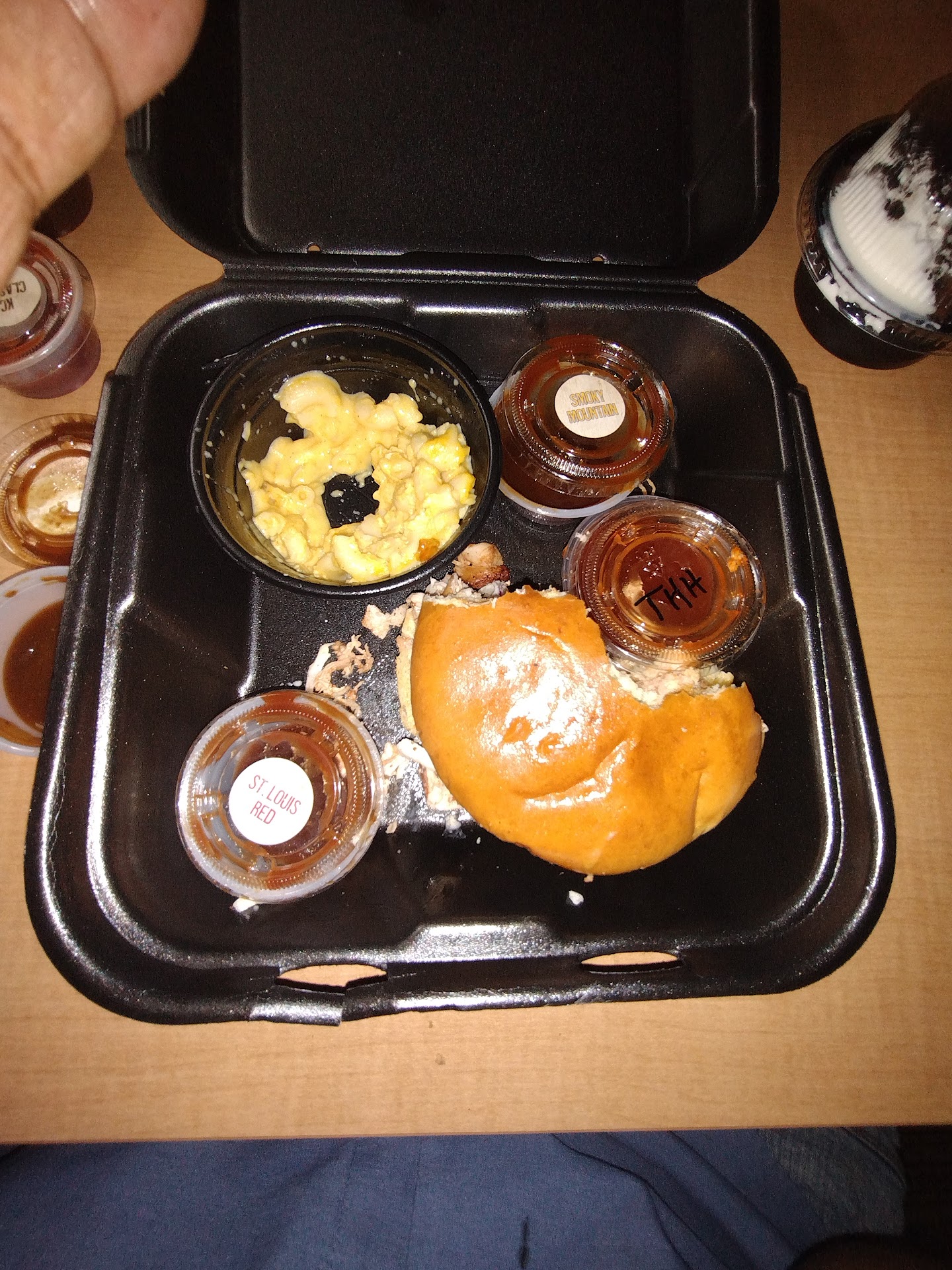 Read moreWas pleasantly delighted how good the food was about half an hour before closing because at other places, I've been disappointed. But here, it was a great 8:30pm experience. I called in order 20 min earlier and travelled from the other side of Springfield to get there. They were making part of my order and bagging up the rest when i got there. NICE! Will definitely be back! I got pulled chicken that was breast meat 1/2 hr before closing and it wasn't dry as paper like other places I've been way earlier in the day! Most impressive. Guy that took my phone order (Tony or Terry or something else. I totally forgot. Feel bad. Sorry bruh!) was patient and helped guide me to a decision as to what to get. If I had to nit pick and and have a not so positive comment, it would be in the form of this suggestion: if corporate would let the buns be buttered and toasted on griddle, they'd get 6 of 5 stars from me! NEXT. LEVEL. SAMMICH. UPGRADE! The other guy that prepped my dessert knew all about each sauce and described them and gave me 6. My faves are in the photo by the SAMMICH in the container. Sweet tea is good & lemonade too. This place is goin my list of bbq faves(its a short list because bbq is a passion & is what...
