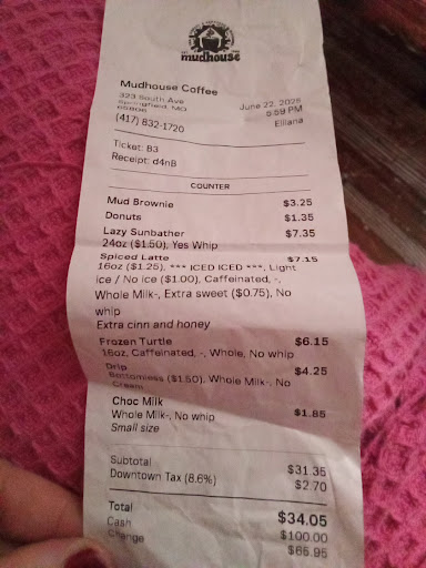 Ā Ā Ā Read moreI took my children for smoothies and brownies, something we do every other week. Yesterday the smoothies and frozen coffee ā wasn't blended with enough ice and very watery. The last visit was the same. The coffee was delicious that was brewed, and very hot. The weekend prior it wasn't. Mudhouse doesn't have any milk options out such as almond milk or oat milk for coffee in case you're vegetarian or lactose intolerant. They said it's 85 cents for additional milk options for your coffee. During yesterday's visit I requested they punch my card for my last visit because I forgot to ask. The cashier said if I could find my last receipt or bank statement she would honor it and put my missing punch,which is supposed to earn me a free drink after 12 visits. So I returned with my screen shot of my Bank statement. The other two cashiers or workers surrounded her on each side and said we're sorry ma'am she's knew she didn't know she's not allowed to honor that time. I said well I spend between 30 and $40 each time I come here and that's really not fair I'm just trying to earn my way to a free coffee and I just forgot last time. The male and the photograph with the curls said "it's not our problem if you can't remember things Karen" I said I assure you that is not okay to treat me this badly, your burritos are cold inside half the time,you gave us watery drinks, both last visit and this one and your coffee is cold almost every single Sunday evening we come. I said I would like to speak to your manager or you need to call her on the phone because I want a refund, I was told I was not allowed to have a refund. I told them I was going to take a picture of them for my review and I was going to tell everyone how badly they treated us.So they posed for the picture smiling. They tried to call after us when we were leaving an hour later "mam,mam, excuse me mam" It's funny how I went from "Karen" to mam when leaving an hour later. I didn't speak to them any longer and the trio continued laughing at us as we left. I felt like I was in highschool again,I guess that's what happens when you leave children in charge of the business on weekends with no management or...