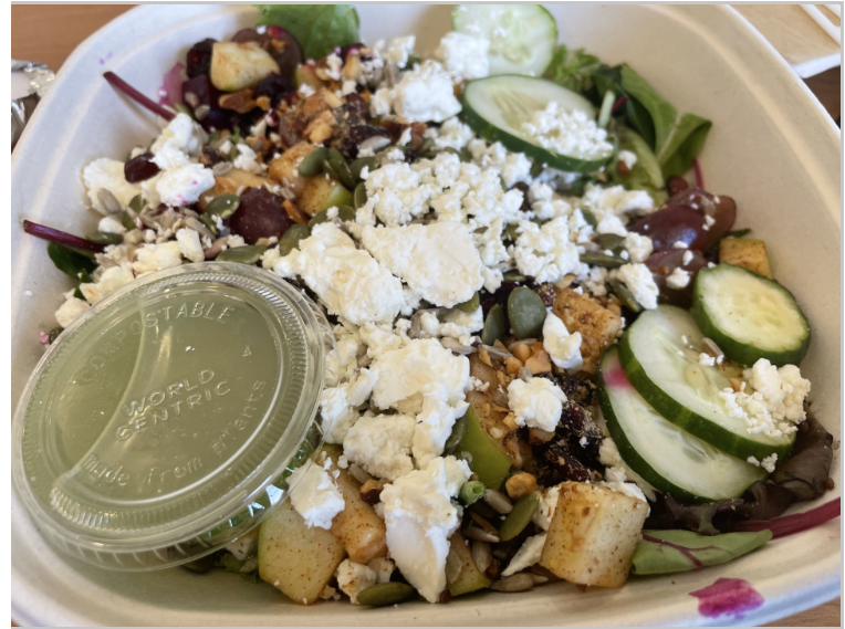 Today I chose Kate's Power Salad. I placed my order online to pay when I arrived and it was ready when I got there. When asked if I wanted to add anything to my order, I noticed what looked like a deep dish focaccia pizza thing on a try by the register, I asked and was intrigued to learn it was made with tomato, onions, spinach and cheese. I couldn't resist and added it to my order.
