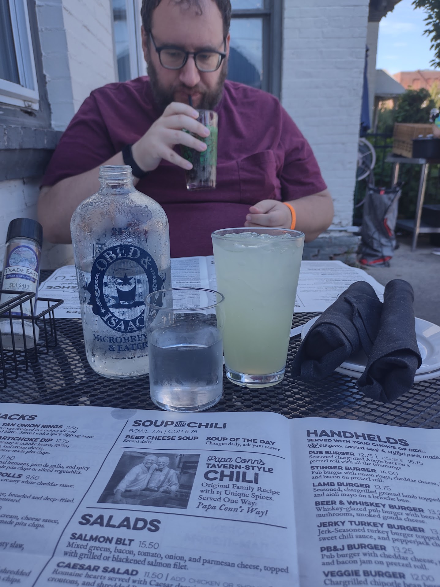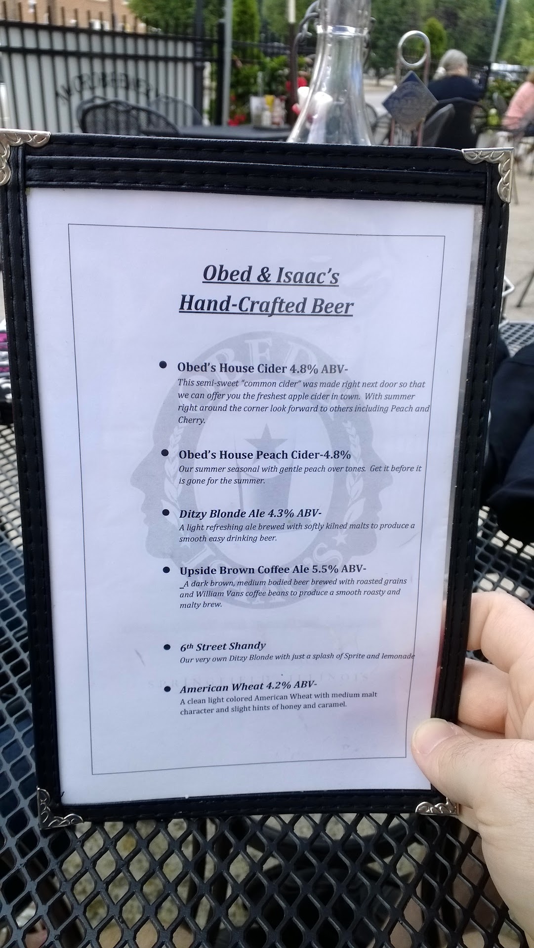 Truth be told, I am not sure how the three of us stumbled upon this place for lunch. I know we headed down to explore Springfield for the afternoon and needed somewhere to eat. Luckily, the weather was in our favor and we stumbled upon Obed and Isaac’s. They offered outdoor seating that we happily okay with. As we were talking to the person who ended up seating us outside, they offered us a glimpse of the microbrewing process. Due to insurance liabilities, we weren’t able to go in the building they were brewing but we got a quick 2 minute tour and history lesson while looking in from the outside. After that, we were lead to our table and given the menus to look at.