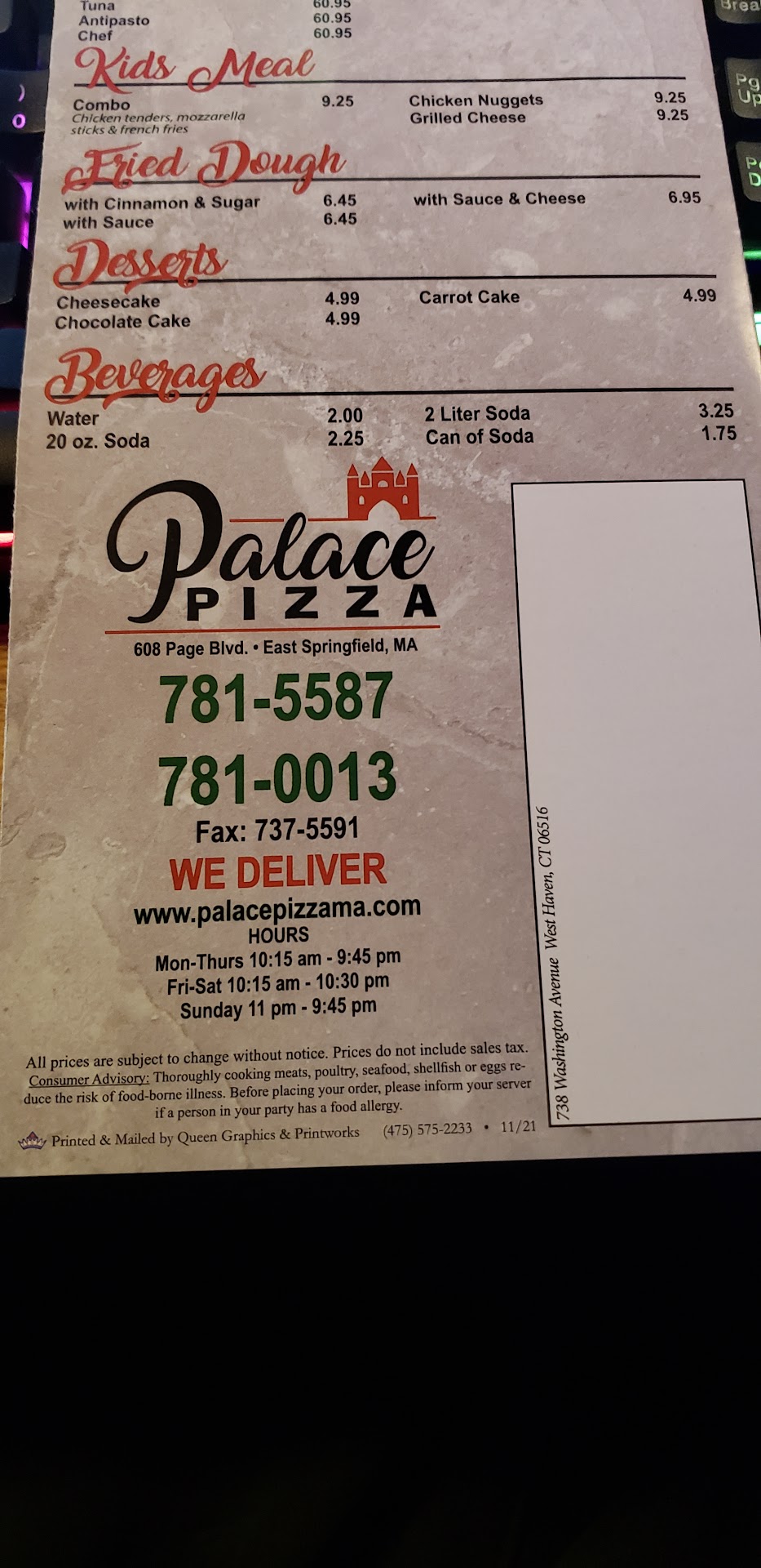 Read moreUpdate: just tried ordering on July 10 at 3:38pm, the girl who answered the phone (not Sierra) was very confused when I asked for a cheese pizza. It took several minutes to place an order for a small cheese pizza pie. She called back 1 min later to say that they didn't have cheese pies. Her exact words were: "THE COOK SAID WE DONT HAVE CHEESE PIES, WE HAVE SPINACH." lol, ok then. Sierra was amazing! And the pizza never disappoints. Palace pizza is a little bit farther of a drive for me but it’s worth the drive. Customer service is 10/10 and so is the pizza. I’m originally from NYC and this is the closest that Spfld comes to NYC pizza. Deff recommend and will always...