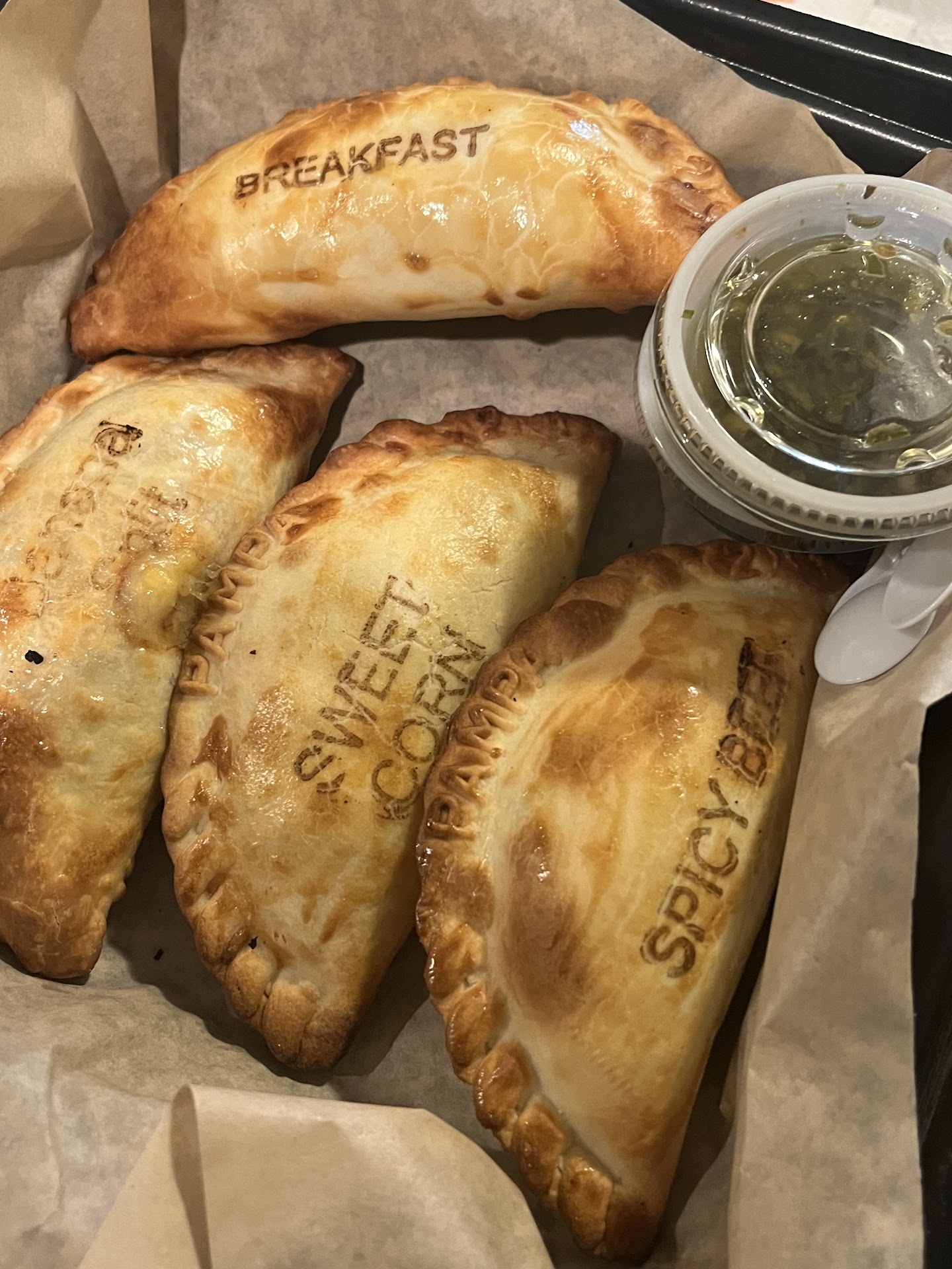 We got the spicy beef, sweet corn, banana split, dulce de leche, and mushroom. They were all seriously amazing. The dough is so perfect it’s unlike anything we’ve had before. The chimichuri is also amazing. Everything is homemade and you can definitely taste it.