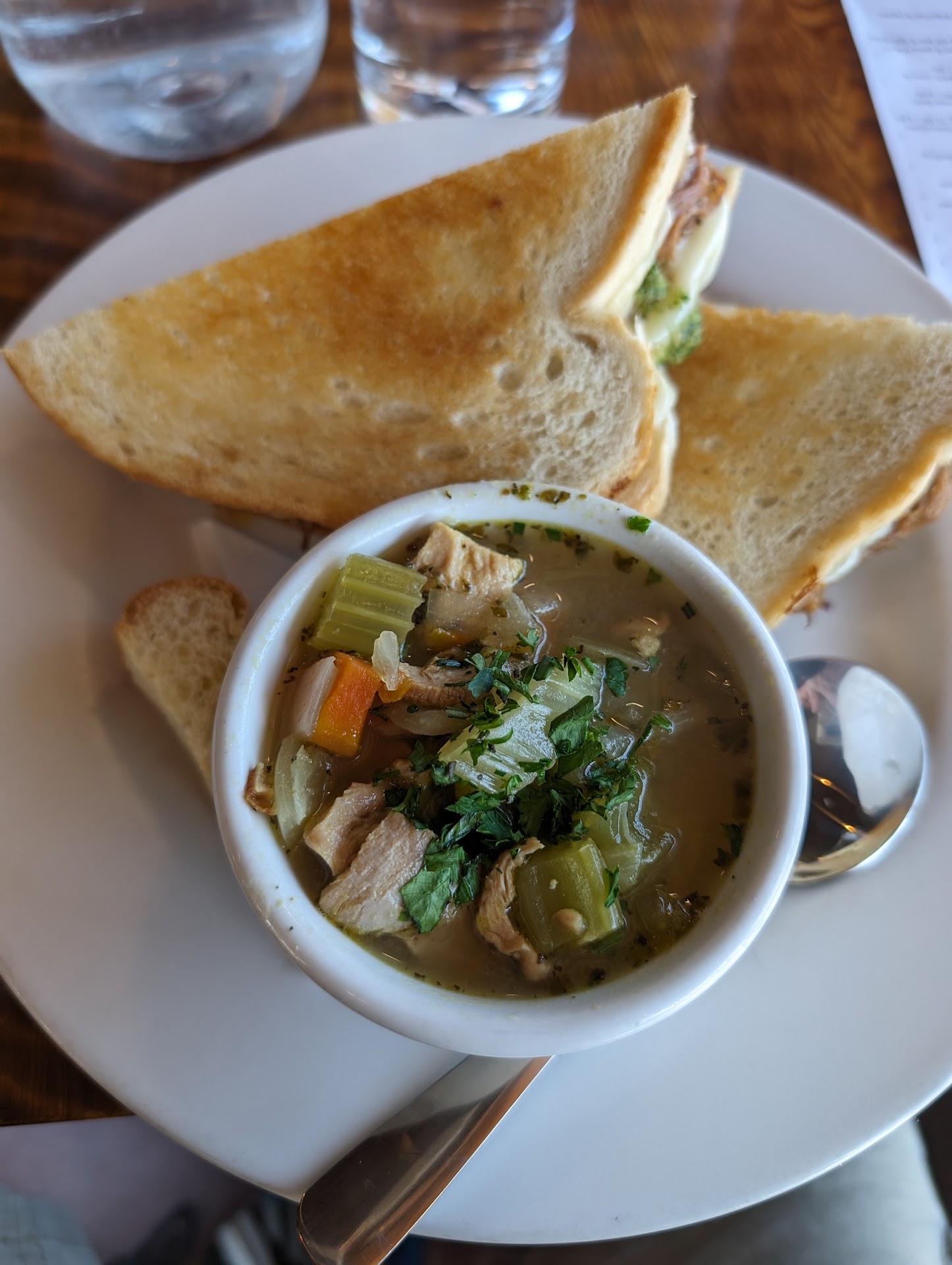 After a little more than 10 minutes, our waitress came over to get us water, silverware, etc. Yes it was more than 10 minutes, I timed it when I realized how "relaxed" everything seemed to be. We asked our waitress if we could move to the table about 20 feet towards the front of the restaurant (2 top), she said sure.