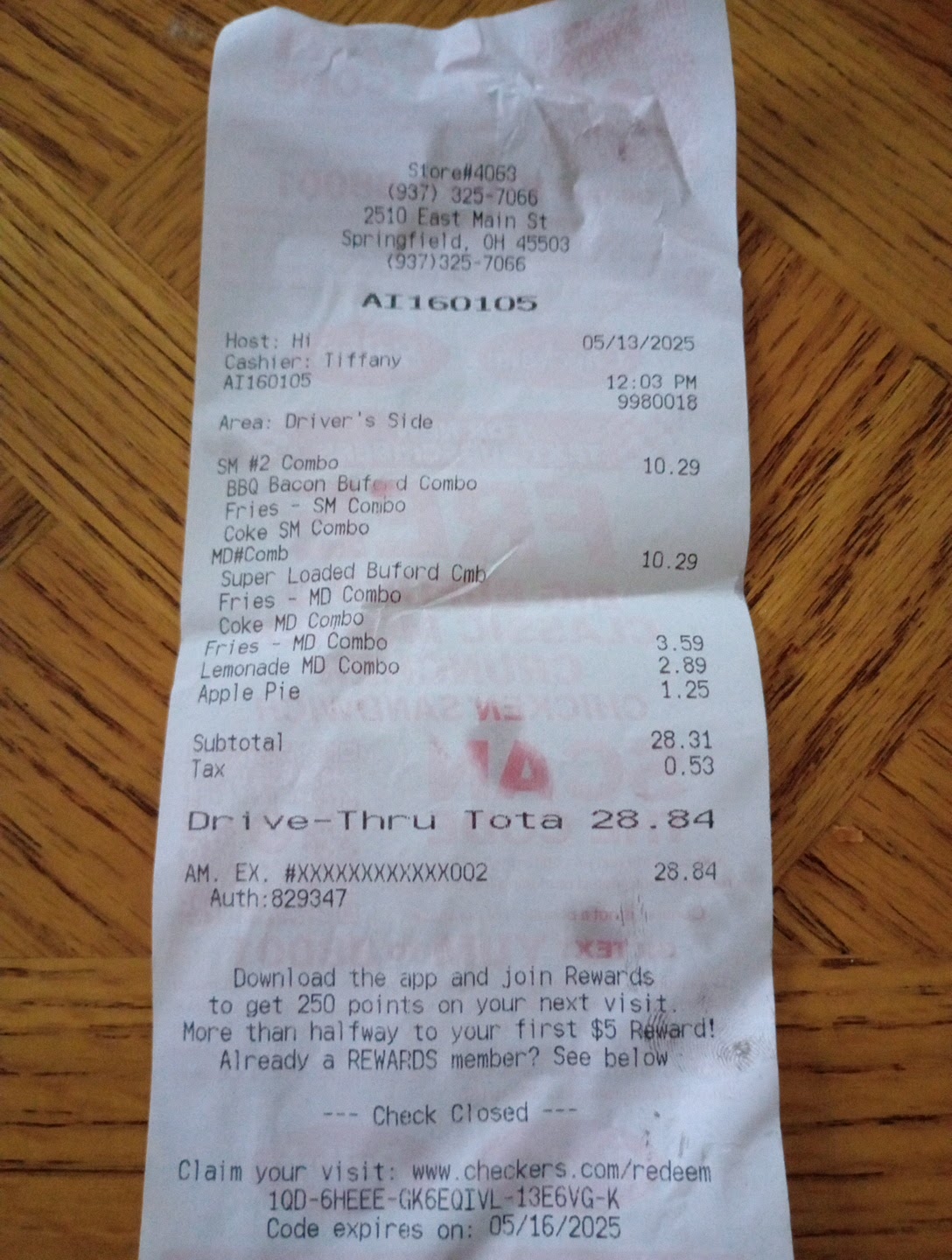Read moreThe sassy cashier had to insist that I don't understand taxes that my totals are off because I was totaled was totaled on the receipt 35 cents for the drink tax. The AI was pretty good through the speaker but I've never experienced it so I was very confused I told the AI I thought it was a wrong total well the problem was when it asked if you wanted to go big I'm like yeah sure but I didn't see that on the screen because there's no screen to look at. So it turns out the discrepancy of a $1.99 was the simple Go Large option which I didn't realize was the difference because my math and my head had nothing to recognize on the ordering screens because there are no orders screens all that I can remember but maybe there was but I didn't see the 1.99 but the sassy cashier had to get snippy about it. So if she would have just explained the 1.99 difference was the 1999 to 21.00 difference then yeah I would have understood but she wanted to argue about me knowing about drinking taxes. My boy was in the car and I allowed him to continue the conversation because I was just going to try to shut up and be quiet but she kept running her mouth insulting me so I'll never be back I'm from out of town but if she's working I won't be back anyone else would be fine but the food is delicious at...