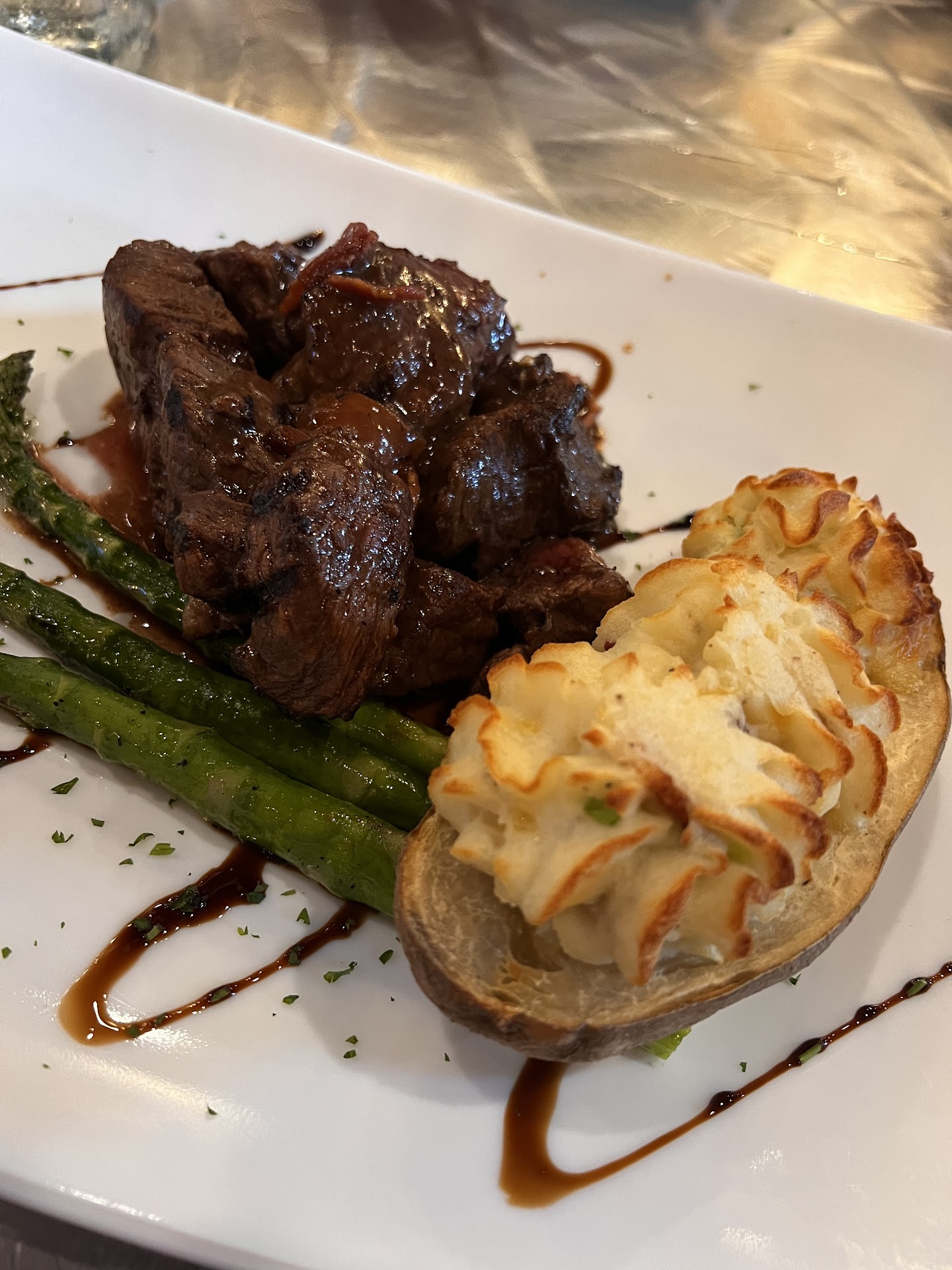 12OZ. NY Strip $34 - Cooked well. Tasted pretty good. Iād give it 4 Stars. A little heavy on the spices. Where it went wrong: Mashed Potatoes looked like they were scooped out of a tub with a ice cream scoop kind of like in the high school cafeteria and tasted like it. 3 Pieces of Asparagus which was average. The sides bring the entree down to a 3 Star. Seems to be a common theme.