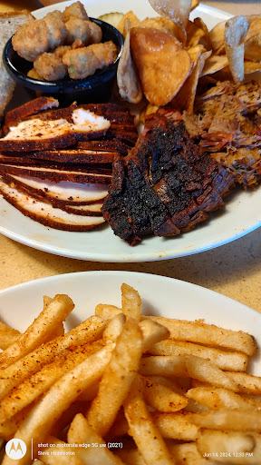 We placed our orders and we both ordered the 4 meat platter. Sides for my son were fresh chips and okra. I got the okra too with fries. The okra was delicious as it had the right amount of crunch. Not soggy. My fries were seasoned very well. We both got 2 orders of brisket, mine chopped his was sliced. My son got chicken breast, I got the sausage. Both of us got the pulled pork.