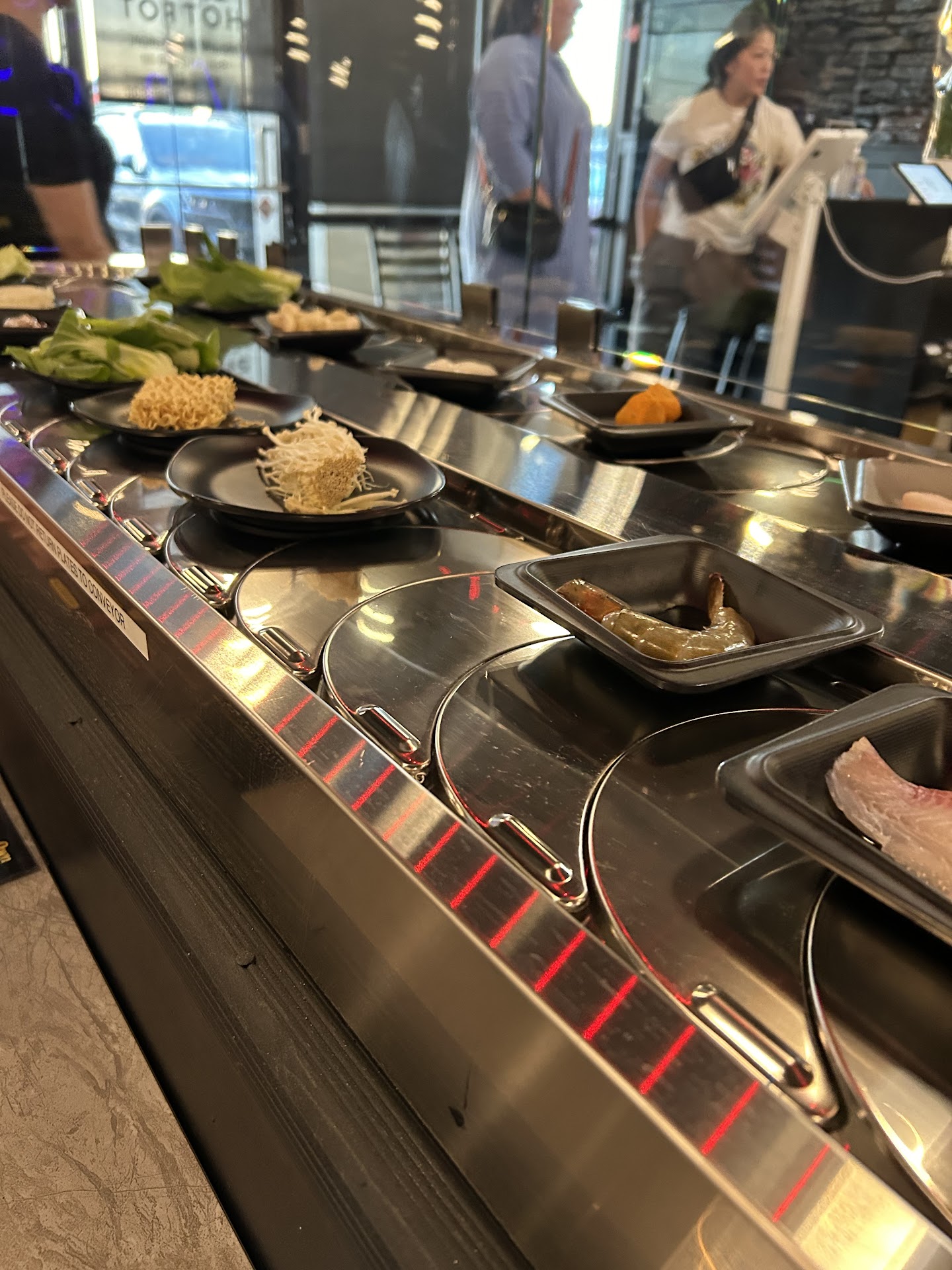 Food was honestly not up to my expectations. If you’ve never had hot pot I think you’ll have a good experience and enjoy the food. However if you’ve grown up eating hotpot or have been to ayce hotpot places before, you’ll likely be a little disappointed. soups: I got the spicy and I expected it to be mala spice flavored as that is usually what it is at hotpot places. It was instead a sweet and sour soup that tastes more like tomyum. It does have a good tomyum flavor and the soup seems to be homemade so if you like that I would recommend. It is not spicy at all so it would be nice if there is an actual spicy flavor and then maybe label the current one “tomyum”? My friend had the beef soup and stated it tasted like pho broth. conveyer belt: clean and kept full. vegetables: good variety of fresh and clean vegetables and mushrooms. seafood: shrimp and calamari were good. Fish tofu wasn’t the best quality. Would also pass on the crab-didn’t taste fresh, although I wouldn’t expect an ayce place to have fresh crab. meat: meat is not cut thin as it should be for Chinese or Korean hotpot (not sure if thicker cuts are normal for other countries). We got all the beef varieties and only one of them looked different. I couldn’t tell the difference between the rest of the beef cuts from how they looked or how they tasted. None of the meat seemed to be very high quality and all the cuts were pretty lean. Pork belly was okay. pot: each person gets an individual pot of soup which is nice. The pot is a larger size than commonly seen at other individual hotpot places and half of it is blocked off to set food that is cooked so it makes the actual soup area smaller. The burner wasn’t very strong. sauce bar: solid options. Seating is pretty tight for anyone larger than an...
