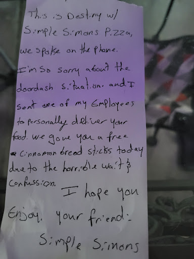 Read moreI had ordered a pizza for delivery, I received a text after sometime from the third party delivery service. My order had been rescheduled for 30 minutes later. After another 30 mins it happened again. After another 10 mins, an employee at Simple Simon's called me. She wanted to make sure I had received my order from the 3rd party delivery service. This was the first time a restaurant had ever called me regarding an order that I had placed going through a 3rd party. She wanted to make sure I had been taken care of, I let her know that I had not received my order and that it kept getting rescheduled. She decided she was going to remake my order and she would make sure it was delivered to me immediately. My food arrived 30 mins later with a handwritten note. This employee went above and beyond, I hadn't called and complained, I hadn't canceled my order. There was no reason for her to reach out to me. She took it upon herself to not only keep track of orders being made, but insuring the customers received their product. This employee goes...