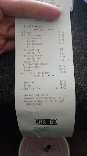Read moreGenerally love Sonic, especially for the bags of ice. Unfortunately, today, we ordered a dozen pretzels and three drinks through DoorDash, and that didn't go well. We received half the pretzels our receipt says we paid for and got no cheese. The pretzels were also overdone and under-salted. The DoorDasher says she only got from you what she delivered. Additionally, we had Rt44 drinks but small straws, and the lids weren't properly sticker sealed.
