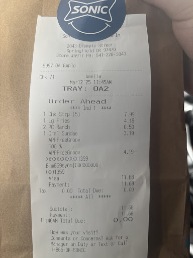 Read moreThis is the second time today I've been to this place since it's open here in Springfield Oregon he used to have roller skate now they just walk how are your two ice cream cones paid for with my Walmart Visa card set there in the car my wife said how about some water husband I push the red button they came back on at 3 minutes later a long 3 minutes like do you have a water please mixing I know charge me $0.30 I said no thanks on the water I can go home and get free water just down the street they still charge me for the water after running my car for the second time the first time they voided it out rear and my card still charge you for the water I was unhappy call for the manager he just called tall skinny guy he doesn't look very clean his clothes look very dirty to me look like he had long hair his face didn't have to clean it he would do nothing to help me he said straight up there's nothing he would do or could do to give me back my $0.30 by the way I still can get my water you think that would help you're having a call to Springfield Sonic restaurant when you have to rip off $0.30 per customer per day that's private or $300 a day and water some people off I'll never go back I called the main office I've never should have through this ice cream cones that's why my ratings or one star I would give him North Stars but you have to give him a rate so they're not even worth 1 star they're going to give it to him beware Sonic in Springfield they are customers off daily $0.10 32 or $300 good luck I'll never go back they lost me forever this time second time was a charm and I want...