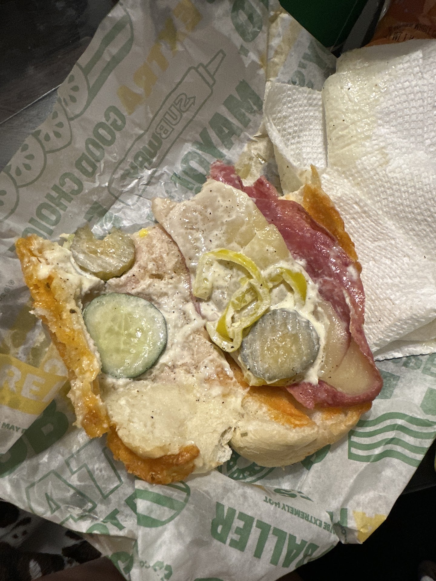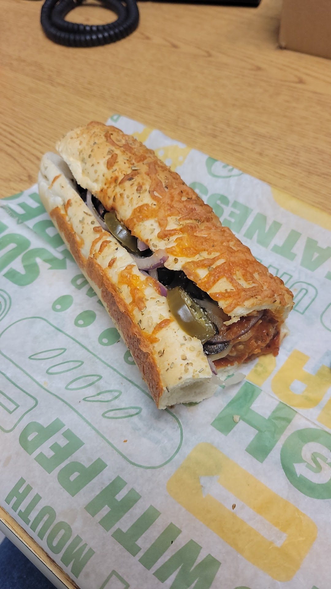 We came in here last night at 8:20 Pm. The moment we walked in the door we absolutely destroyed the boomer employee's life. He couldn't hide his complete disdain for our presence. There was one person ahead of us that was finishing up. When it was finally our turn, boomer boy mumbled and grumbled incoherently. My spouse and I are both veterans, so our hearing isn't the greatest. I still have no idea what this fool was saying. He made sure he slowed to a death crawl in making each of our sandwiches. He really showed us for walking in 40 minutes before closing! It took roughly 30 minutes for him to make 4 simple sandwiches. I ended up just toasting mine when I got home because we had already made this miserable soul suffer for far too long. Perhaps Subway needs a paid naptime for the older generation so they can make it until closing without becoming a...