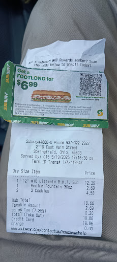 Ā Ā Ā Read moreWorst subway in Springfield rude employees have family member in lobby both employee and manager yelling over the customers to conversate with this girl in lobby while customers are ordering on top of that bread was hard/stale as somebody didn't bake there bread these people are lazy and dirty only had white and wheat left and didn't have much of either left submitted a complaint with corporate received a call from the same manager that I complained on and was hung up on Go to S Limestone new manager is super friendly and doesn't heisitate to load your sandwich up and make sure it's fresh! He goes out of the way for his customers! I went to S limestone after purchasing my sandwich here I was so disappointed will never return...