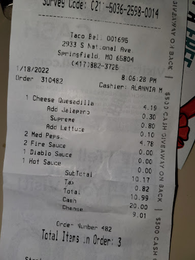 Read moreThis location is very hit or miss. They have been getting my order right fairly often the past couple times but they tend to not pay attention when you order. I once ordered a nacho bell grande with no beef and they left the beef on it anyway. Obviously as someone who doesn’t eat beef this was horrible and ruined the entire meal. However I did email the company on the receipt and got a free taco coupon in return for it. Another situation was more recent when I ordered a Cheese quesadilla no jalapeño sauce and they gave me a chicken quesadilla. They are very bad about not including the meets on foods so if you are vegetarian or similar I don’t suggest going to this taco bell.