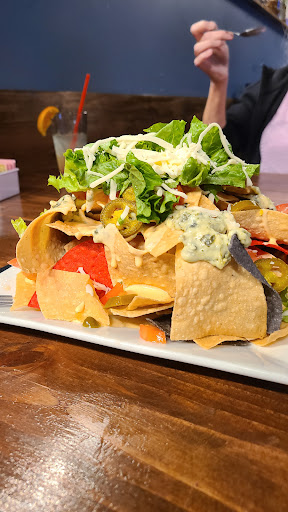 The food was okay but it wasn't anything to write home about. I ordered the nachos which were difficult to eat. Granted, they are referenced on the menu as a mountain, and they certainly come out looking like one. All the toppings were on the top so most chips in the middle were dry. The chips were stale like they'd been out all day, and the plate was too small for the mountain so I was spending extra time trying to dismantle my meal without making a mess.