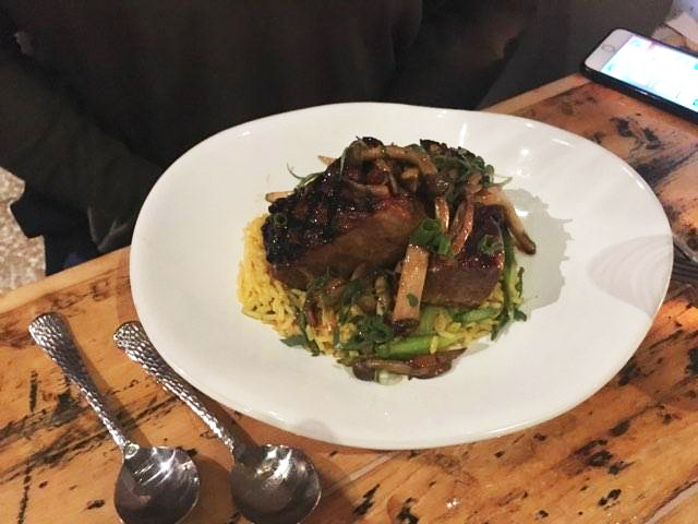 Main course we got the mushroom linguine. The flavors were excellent, but it was a bit heavy on the cream. It was a bit soupy, and I think it would have really helped to serve it in a wider, shallower bowl in addition to having less sauce. It was really hard to get noodles, mushrooms, and greens all in one bite b/c everything kept slipping off my fork.