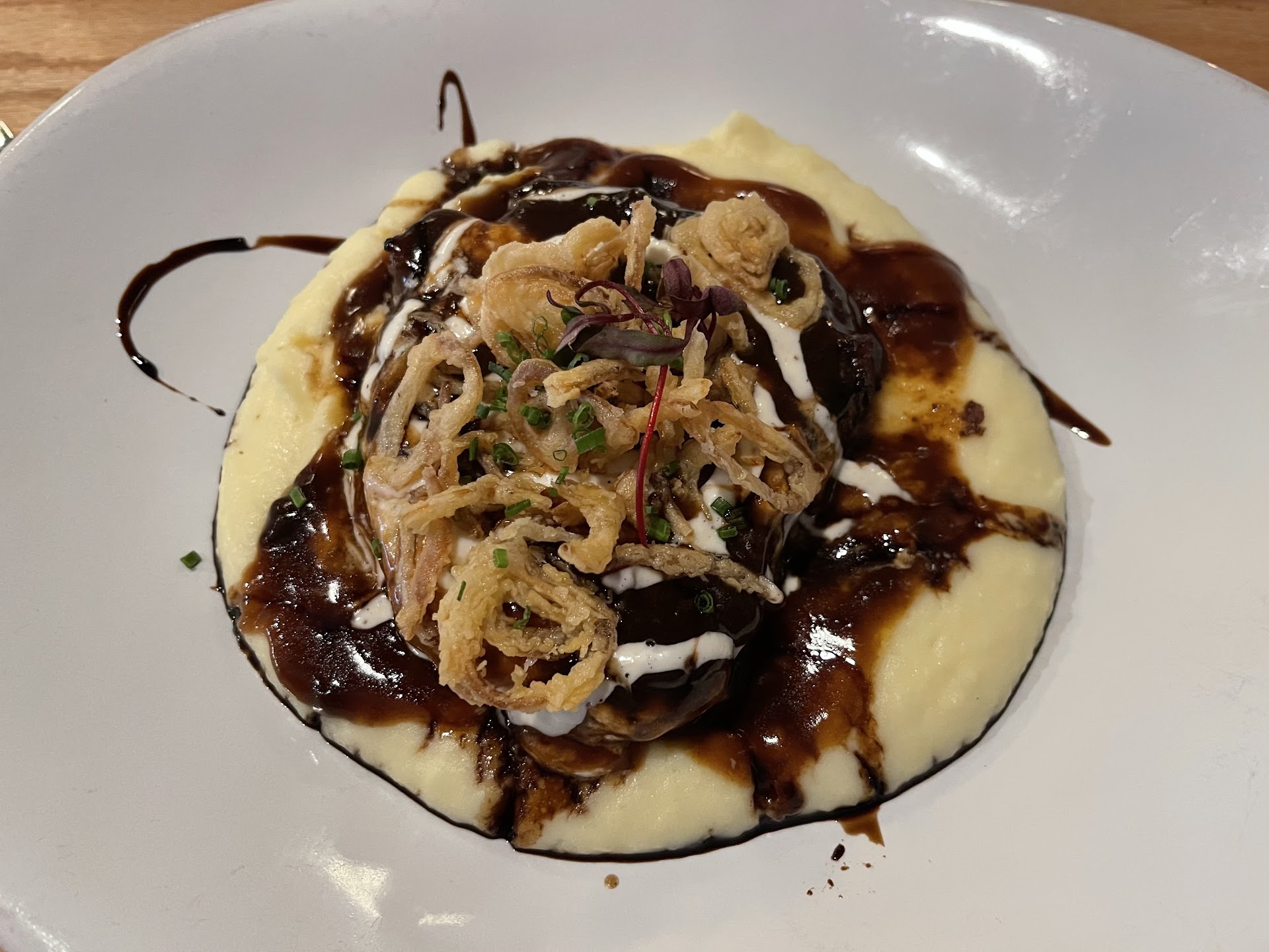 I'm a bit torn on this one b/c there were some distinct highs and lows on this dining experience. Started with a complimentary sampler of champagne, which turned out to be the perfect amount for us b/c I don't drink champagne and my wife wanted to have just a little bit. Ordered the olive oil tasting appetizer, which was really good when we finally got it. It took a while b/c there was an issue in the kitchen where they burnt the bread and had to prepare another loaf, but the communication on the issues wasn't great so we were sat waiting for a while without knowing what was happening.