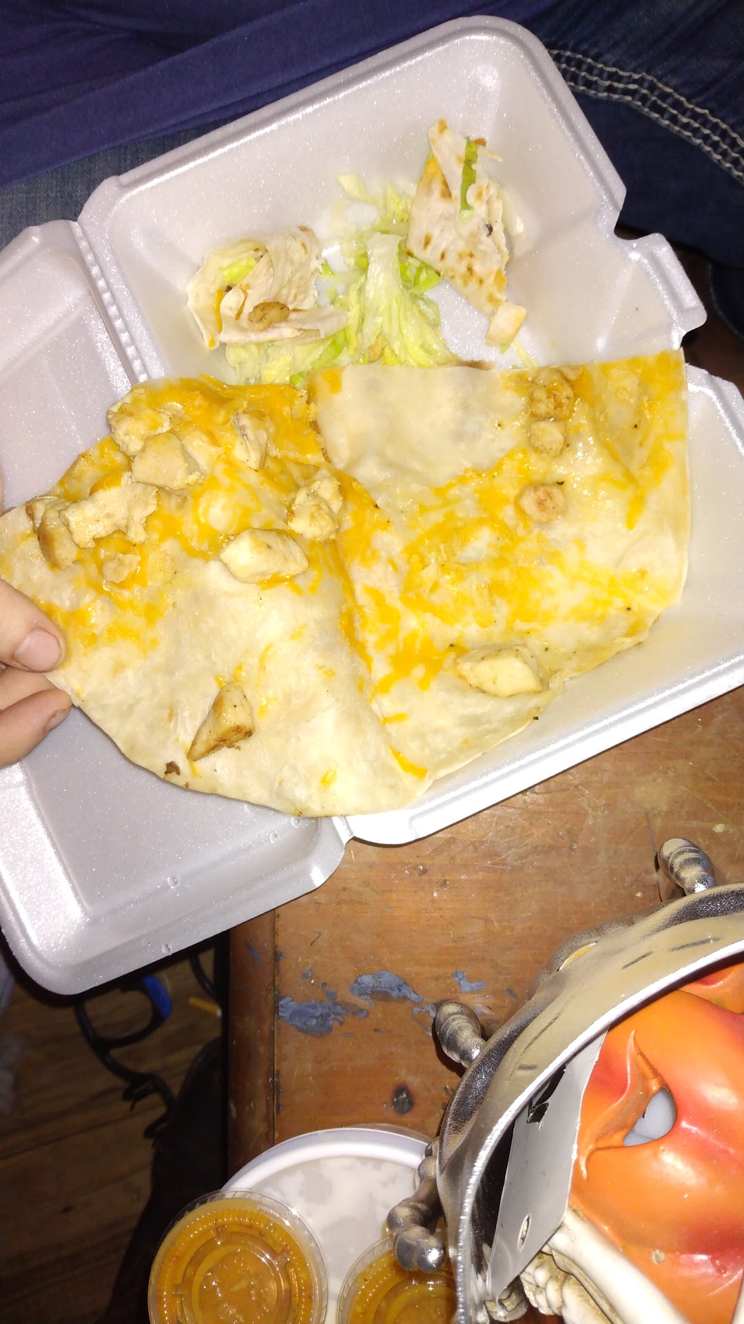 Read moreSo today is November 30th 2021 I ordered my food probably around 10:00 p.m. maybe a little before maybe a little after give or take we ordered two chicken quesadillas one with only lettuce the other just chicken and cheese and I asked to have a small amount of rice substitute the pico de gallo guacamole sour cream and lettuce they said okay my wife wanted a side of nacho cheese. Instead as you seen the picture we got a very skimpy poorly made chicken quesadilla 799 a piece and instead of giving Sinatra cheese on the side we still received all the sides it seems like and queso cheese that's watery and a bag of nacho chips that we didn't order that were stale unless they come free and I'm not aware it was our first time eating there and it will probably be our last but I am going to call and ask them to replace my order or refund it one I was terribly disappointed and felt like this is just not what I should get out of a homemade authentic...