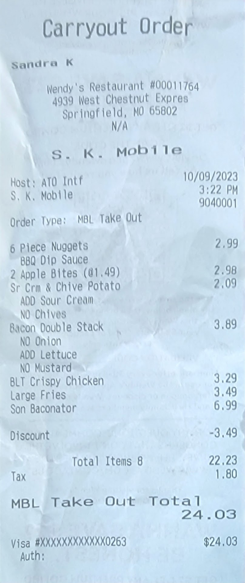 I ordered delivery. While I didn't like paying nearly $7 between service and delivery, it is what it is. I was hungry and wanted food for lunch, dinner, and lunch for next day. It arrived in the estimated time. The 1st bag contained my crispy chicken biggie bag. It did not have the dipping sauce for the nuggets, but whatever, I was concentrated on the fries and frosty. Then I opened the 2nd bag, which contained baked potato, Chili, and apples. Expecting the dipping sauce and the extra sour cream and butter for the potato. And extra sour cream and saltines for the chili. Of which there was none. Also, I paid for cheese on the baked potato and there was none. Though, I did get the extra chives I requested, but who wants to eat a plain potato with extra chives. The chili did have the cheese and onions added. I was pretty disappointed because I was looking forward. I know all these things sound small trivial, but the small things matter. Sour cream and butter are pretty basic, especially when it printed on the order. I try to call the location. It rings and rings, then goes dead. Ok... I try again and again, the same. I wonder. So, I call another location just to see if not answering the phone is a Wendy's thing. Answered in 3 rings. I tell him a little about this and he tells me that this is a corporate Wendy's (not a Hamra Franchise). Now things make a little more sense. Long story short, support local business and do not order from...