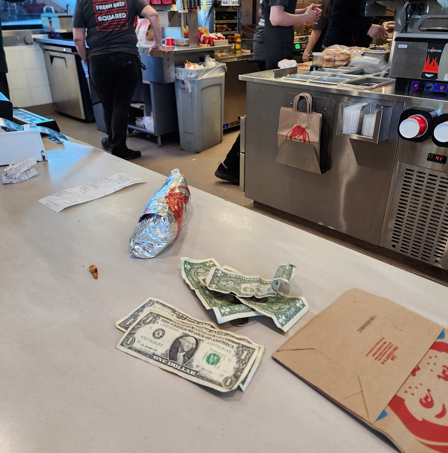 We walked in and placed an order at the self-service tablets for a single item: one chicken wrap. After waiting over 15 minutes for this, while seeing rogue chicken nuggets and fries strewn around the lobby counter, we waited patiently for our food. I noticed multiple employees remove their gloves and continue working without handwashing in our less than 20 minutes there. When our food was finally ready, the front counter employee was counting a stack of ones and paused halfway through to grab the chicken wrap - handling money in one hand and food in the other. He proceeded to place the money and food down on the counter to grab a bag, and that's when I decided the contamination risk was too high and I no longer wanted to put that food in my body. What appeared to be a manager came over to assist with the refund for us, and I explained to them what the problem was. They had no concern at all. I will not be returning. If this is how gross their lobby is, I don't want to think about how the kitchen is...