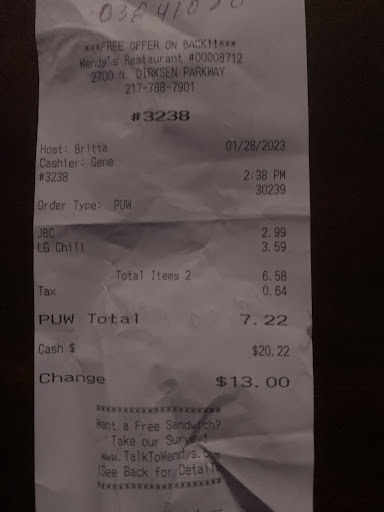 Read moreThe worst experience at a Wendy's ever. The crabby woman who was working the counter was complaining about how little she I believe she was a shift manager. The soda machine was out of ice, so the drinks were room temp, which was pushing 80 degrees because the AC could not keep up. The only bright spot in the whole dining experience was the new lady who took over the ordering process. I would assume she was late 30s and Hispanic. She was very positive and friendly. The food delivery was extremely poor. They skipped my order and 3 orders were filled before mine. The fries were not salted, and there was no salt in the dining room. The chili was not cooked all the way, and the chili beans were still too firm. Do yourself a favor, and the next time you are in Springfield, IL, just go next door to Culver's. Better food, better service, and better attitudes. To the lady who took my order, please apply at Culver's and get out of this...