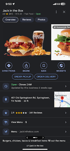 Read moreI recently moved from Weatherford to springtown. I am also pregnant. My wonderful and amazing man. After watching me cry over multiple food commercials and listening to me complain about being hungry decided to go get us Jack in the box with his sister. Now this is my 3rd time going to this jack in the box. 3rd time in 2 weeks. And I am most definitely not impressed. Not only am I not impressed but I am pretty disgusted and disappointed by each visit I've had (there or not).