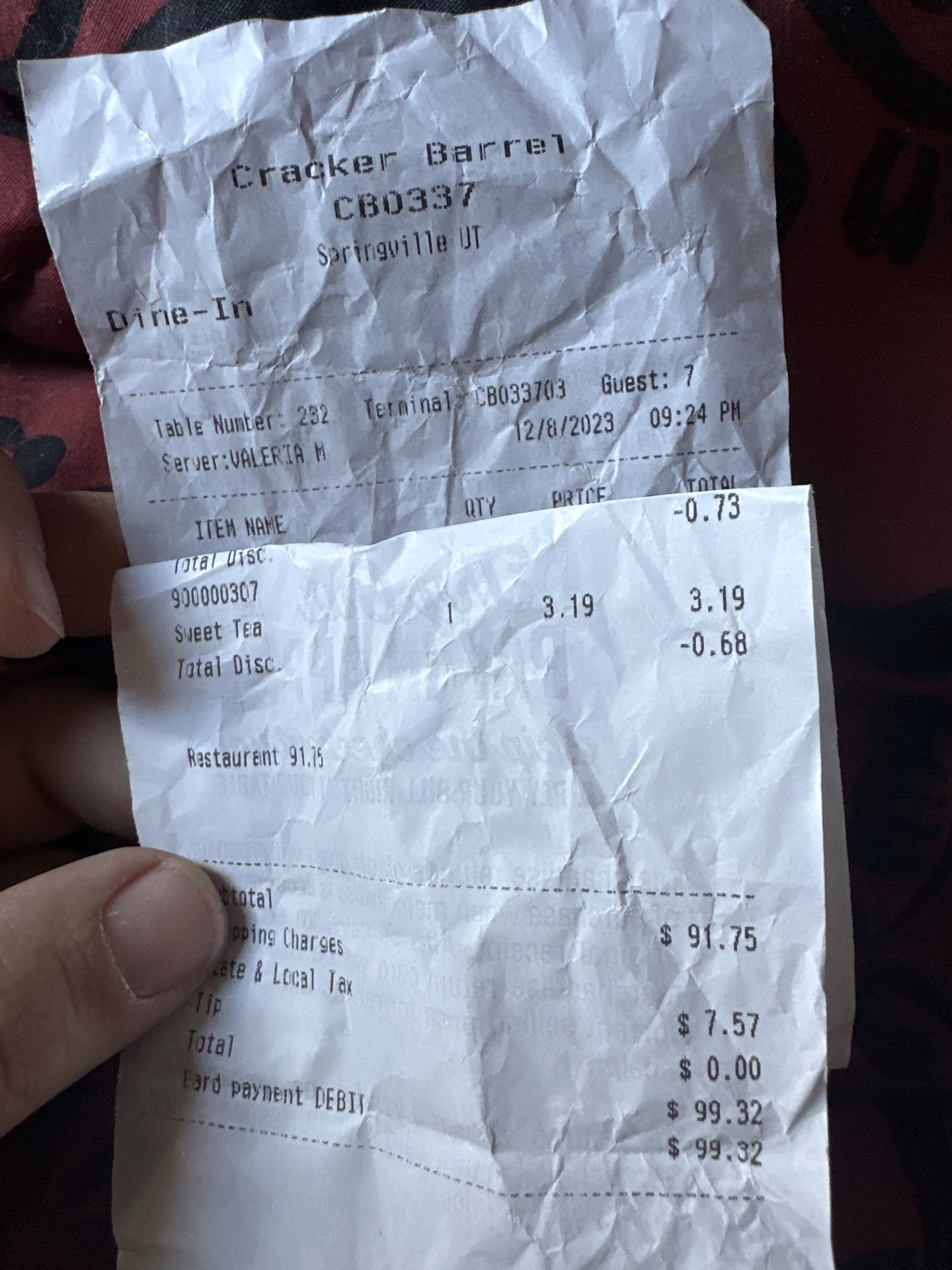 To put the price into perspective, our family of 5, usually costs about $85 - $100 each time we go to a sit down restaurant (20 % tip included) and the Cracker Barrel is usually around $65 - $65 (20% tip included).