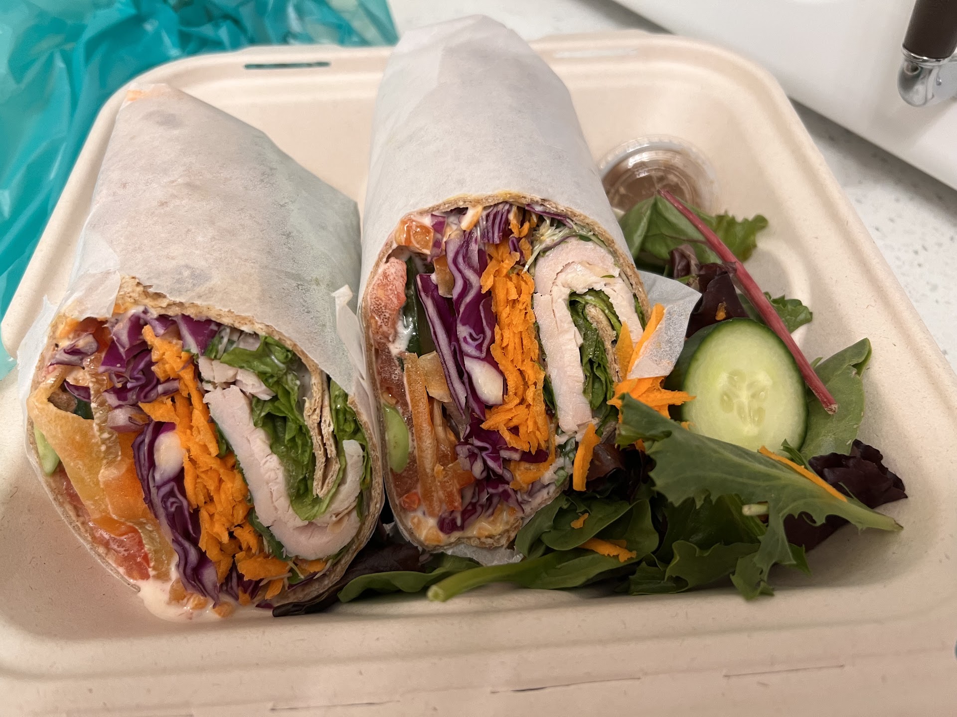 I ordered the cauliflower soup and the veggie wrap. The soup was really delicious and I was pleased with the amount of flavor it had. I was nervous about the veggie wrap. It's hard to have a wrap and all veg and have it taste good, but their house ranch showcased all of the veg. The sprouts were my favorite and everything tastes so fresh and delicious. I got the Mellow Yellow smoothie for dessert and it was pretty good. It was extremely sweet for my taste, but I did enjoy having a smoothie with mint. I think next time I'd get one with greens to balance out the sweet. I was really hoping to try the Thai wraps, but they were sold out. There are several offerings that looked really good, so I plan to try them. The falafel salad looked great and the house ranch is fabulous. I plan to buy a bottle next time I visit.
