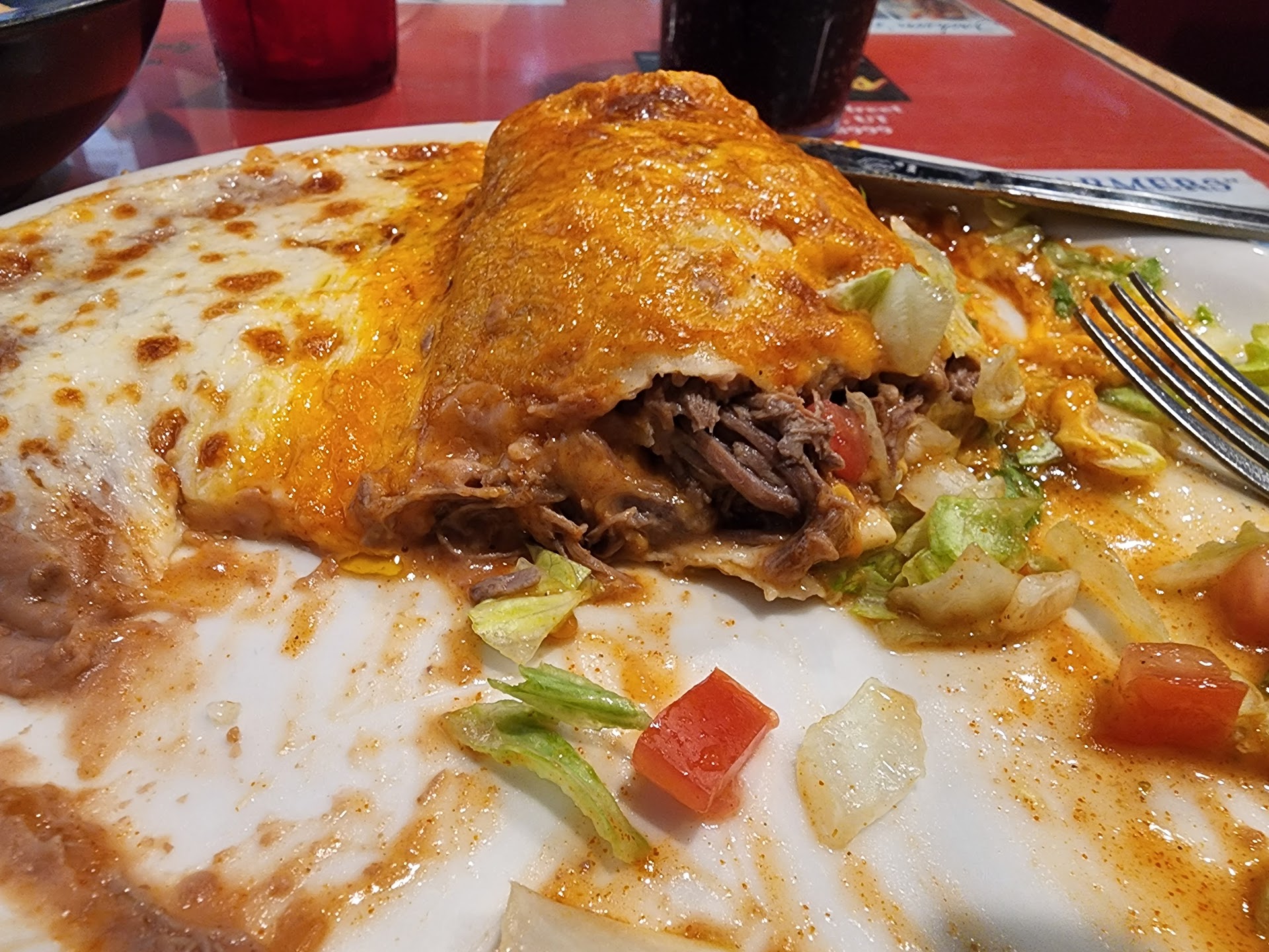 I ordered the shredded beef and cheese burrito and a Diet Coke (served from the their fountain although Pepsi products make up the majority of their soda selection). Served in a nice large glass with ample ice and a prompt free refill.
