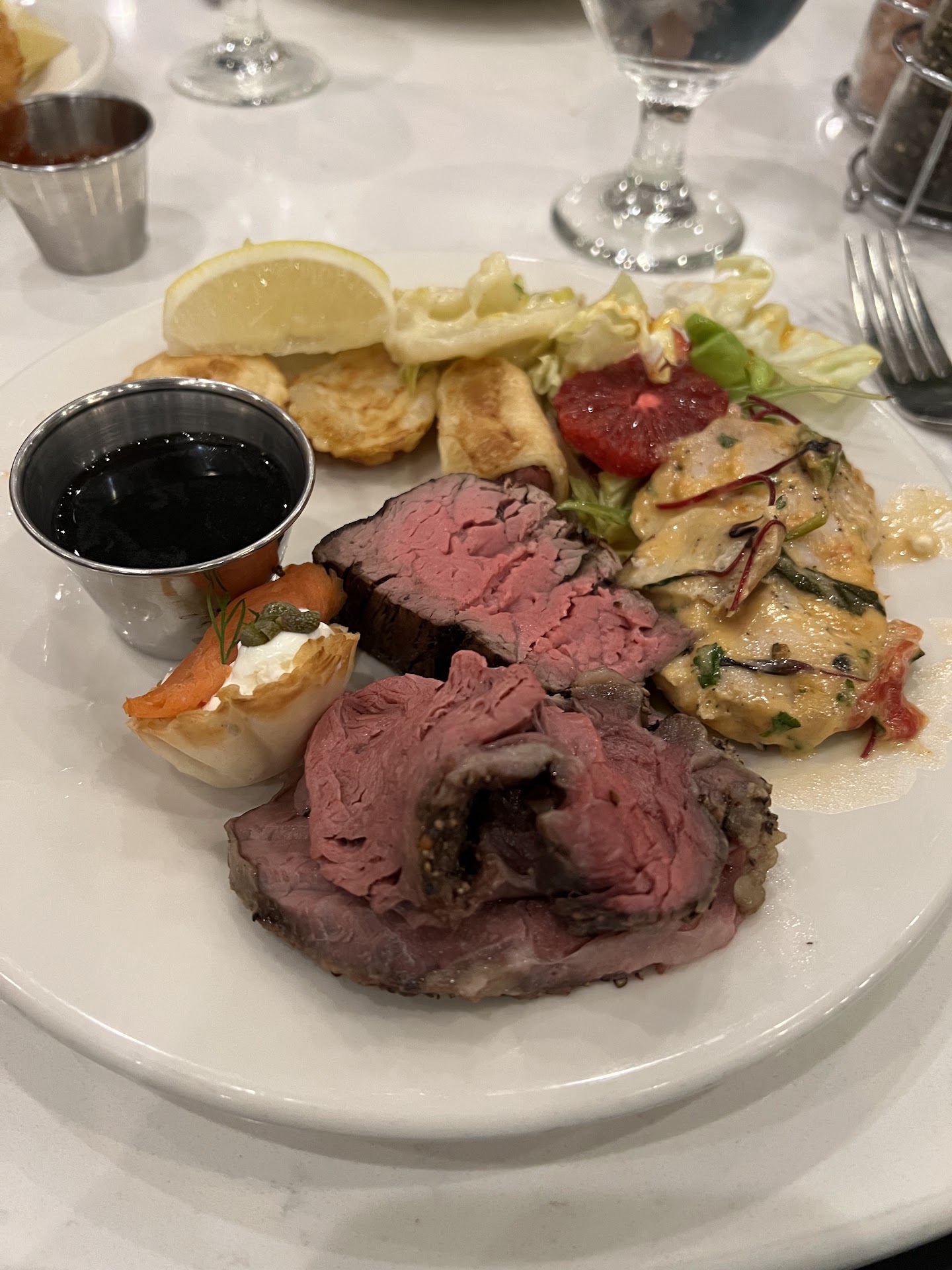 The sauce smothered the fillet, it completely removed any steak flavor. There was instead, and overwhelming flavor of herds, rosemary perhaps? It was not paired well for steak, for those who enjoy grilled meat flavor. We had assumed the sauce would be in the side, that was our mistaken assumption. Serves with asparagus, which were delicious & perfectly prepared. Baby potatoes were cold and could best be tolerated by dipping into sauce that was poured over steak.