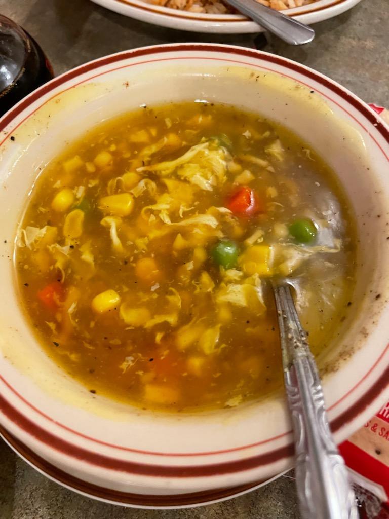 The eggs drop soup was foul, just look at the photo I attached. Would you want to eat that? It had the consistency of mucus and was bland. The corn in the was obviously from a can.