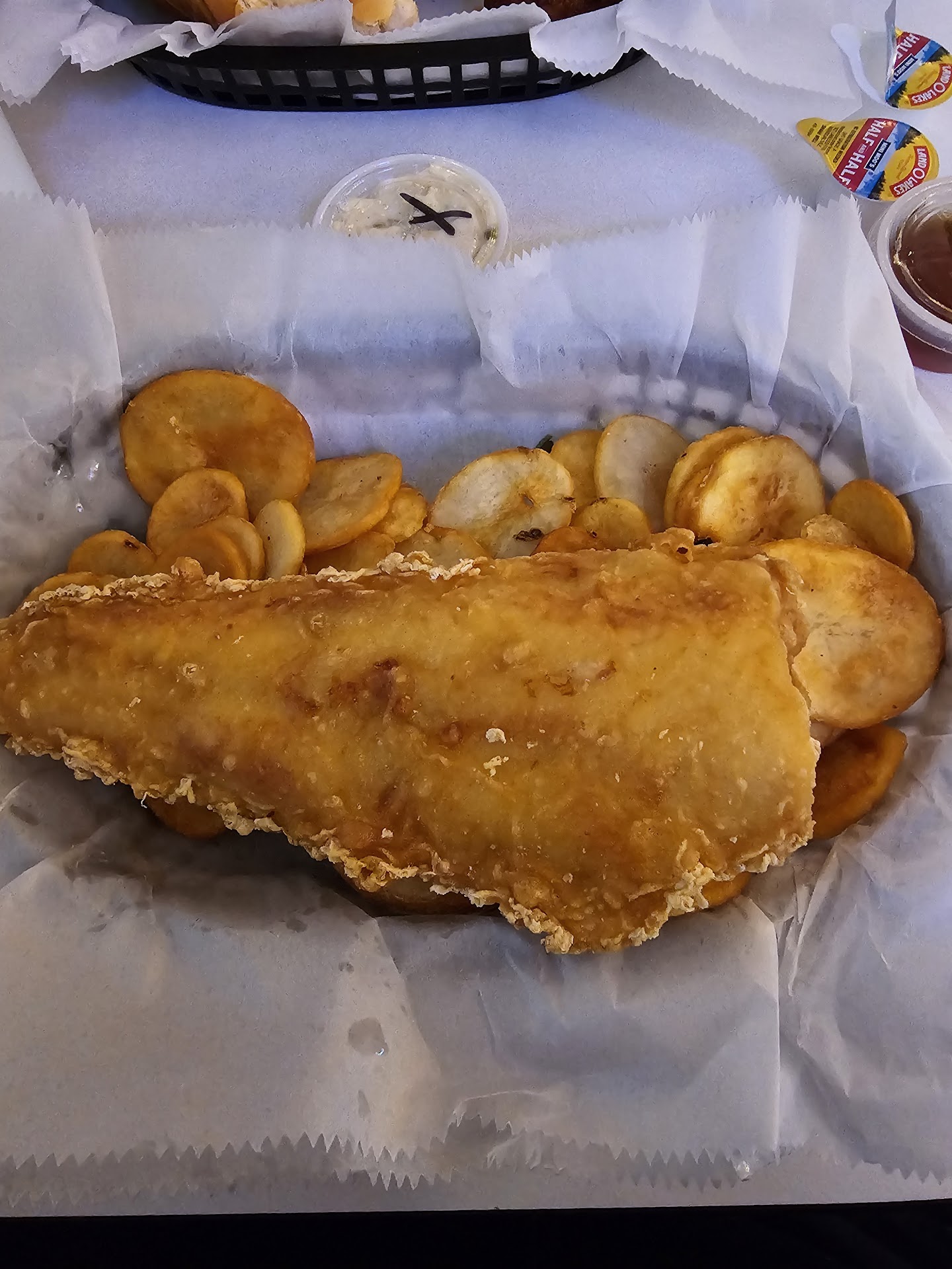 We thought the prices were too high for the amount of food you get. The tomatoes were fresh, salad was good, and shrimp Quesdilla was tasty but needed more shrimp for the price. Crab cake was soggy & bland. Waitress was so so. The fry cook girl was Very helpful. She'd make a good waitress!! Super kind & hard worker (had red hair in a bun) way better than our server in our opinion (dark long hair). The flounder sandwich was not enough fish for cost. Side winder fries good too. The BBQ sandwich was ok. Good portion but bun was completely soaked had to throw out the bun 100% maybe serve meatless or toast bun. Kids meal good. Think best thing was the outside atmosphere, garden area & view. We sat outside on picnic area. Had to ask for napkins ketchup to go boxes lids for the Styrofoam cups. Meals was 137$ I think we will go again if is late & other places are closed. But the indoor work crew should change places w the outdoor employees for few days to get an idea. Our fry girl helper was...