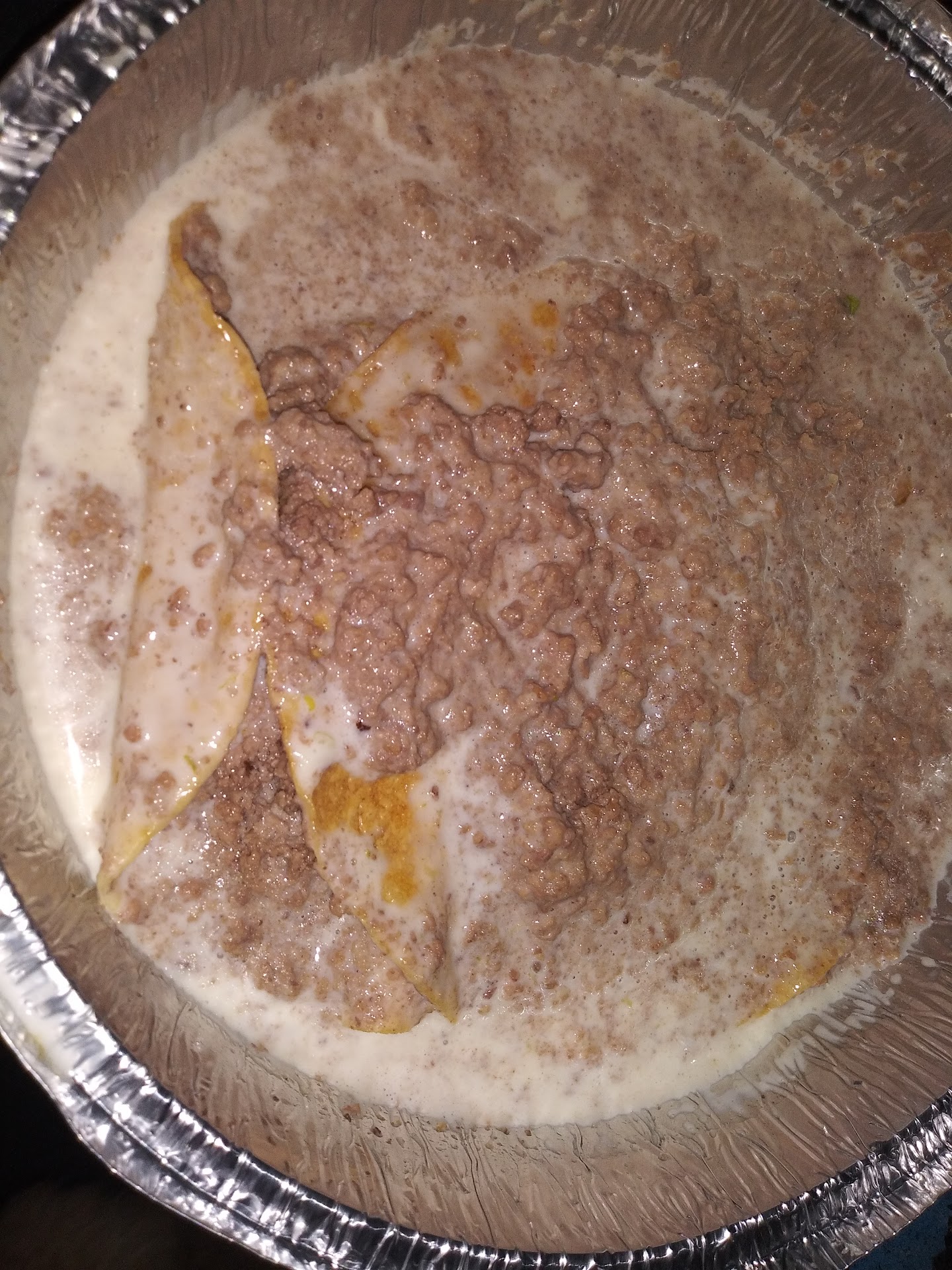 Sitting on a low taco shell bowl (tasty) was a sorry, soppy pile of a small bit of cooked lettuce, the meat-onion-white cheese-guacomole- and sour cream, soupy with a watered down white cheese sauce liberally soaking through absolutely everything near it on my plate.