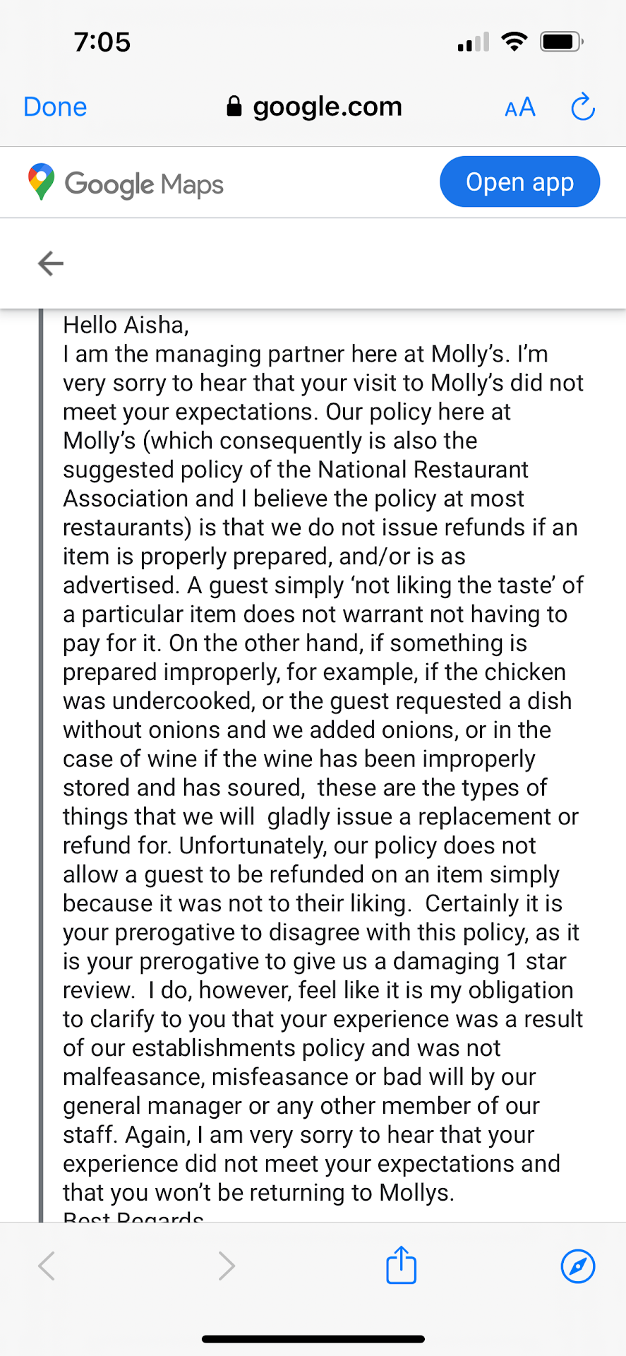 Read moreI hate giving Mollyâs a 1-star for service, as my niece and I visit this establishment frequently. My niece and I attend The Taco Tequila crawlâs that are held once a year and we always stop by at Mollyâs first, as thatâs our check-in point and then we circle back and make Mollyâs our last stop for the delicious oysters and drinks. Yesterday we ordered two glasses of wine. Unfortunately the glasses of wine were not to our liking. I explained to the lovely lady who was taking great care of us, whose name I do not know, that we simply did not care for the wine. I asked if they could be taken off our bill and she said that she would bring the manager over. When the manager arrived she asked what wrong with the wine which was irrelevant. The point is we did not care for what we ordered and should not have to pay for those items. Mind you we were happy with everything else but the wine. The manager who was clearly not going to comply. When asked if I could speak to the person above her, her response was that she was the General Manager. I explained to her that obviously thereâs someone above her and I would like their contact info. She refused to not only give me her name, but refused to give me the info of who is above her. She then tells me that I would be paying for the wine even though it was not to our liking. She then goes on to saying that once they open the bottle of wine thereâs nothing they can do. I could completely understand if we had drank the whole glasses of wine, but that wasnât the case. We took a couple of sips and decided it was not to our liking and we shouldnât have had to pay for something we didnât care for. Needless to say we were completely disappointed in not only the service, the unprofessionalism of the manager and how we...