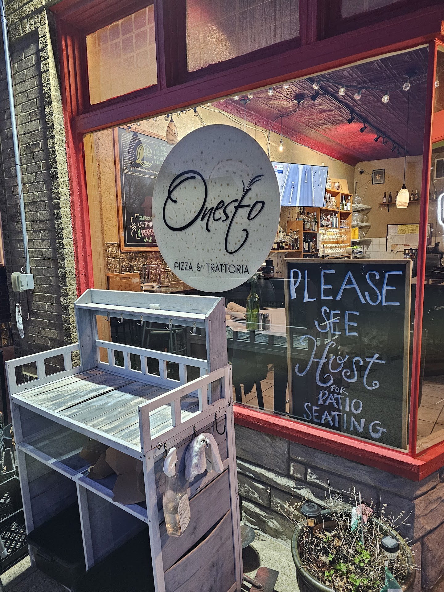 Read moreWe had heard such great things about Onesto from locals and by reading all these great reviews. It's possible we just went on an off night and we probably should have just got the pizza! We started with the Arancini... let me start by saying I love Arancini, but these were the most off tasting things I have had to date. We ate only a few bites. Next came the entree; I got the Chicken Spiedini, which I love also. Not sure how much oil was used on this dish, but it was literally covered... oiling down any taste this dish might have had and the chicken was so overcooked I had trouble cutting it with my knife. I only ate a few bites of this too. My partner got the Rigatoni, but after a few bites she asked me to taste it because something was off... We think it was the sausage used as it had a strange metallic, yet spoiled taste. Might have been the problem with the Arancini also! My partner and I were laughing at how unbelievable bad the meal had been so far. We are very polite patrons and understand the difficulties, so we didn't make a fuss at all. The waitress was pleasant and could tell how displeased we were with our dishes, but said nothing. She didn't even offer a to-go box because she could tell we didn't like anything we were served. But again, said nothing. The best part of the meal was the glass of wine I had, but with a bill of over $80. I'm going to count this whole experience as...