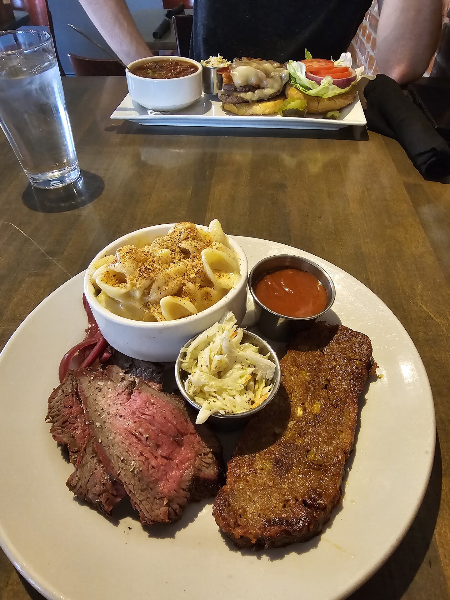 THE MEATS: I ordered the 2 meat combination plate with tri-tip and meatloaf. The tri-tip was fantastic and perfectly cooked. The meatloaf was VERY smoky, which caught me by surprise. It's the most unique meatloaf I've had, and while good, was a little overwhelming for me. However, my partner loved it. The texture was perfect for a meatloaf, and honestly I was just intrigued more than anything when I saw it on the menu. I would definitely recommend it to meatloaf lovers looking for a little something different. The brisket burger is delicious and the bun is nice and fresh. 2 thick patties of ground beef.