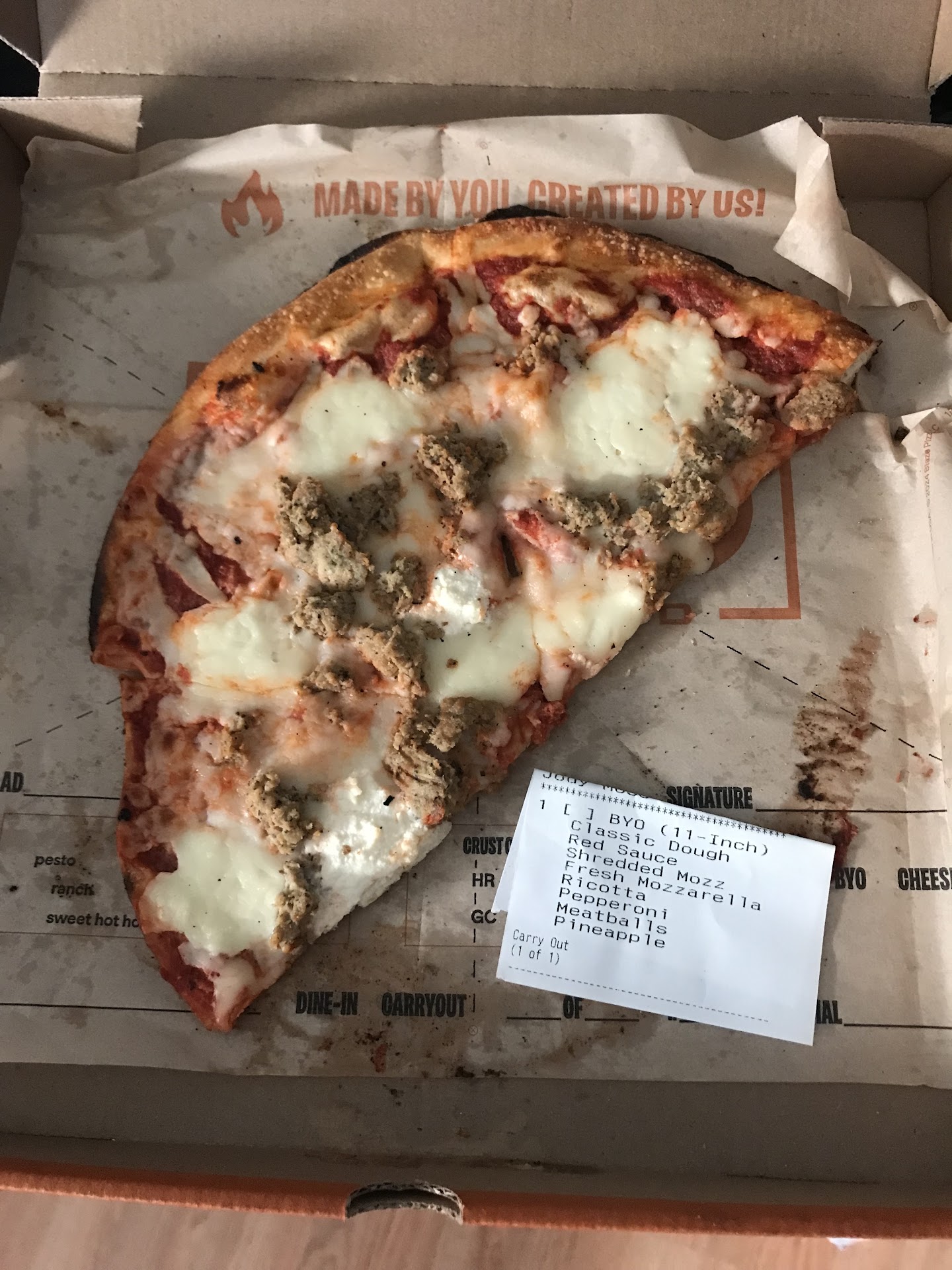 When I appeared on-time to collect my mobile order, my order showed on Blaze's app as already having been collected, so naturally I inquired with the staff. The staff proceeded to present me with what seemed like two-thirds of my order: two pizza boxes. I presented proof that I also ordered cheesy bread. To the staff's credit, the attendant made the cheesy bread for me reasonably well and quickly. I was thankful for this as Blaze was jam-packed and incredibly chaotic. I then went home confidently with what I thought was my order (given that Blaze Pizza had never done me wrong previously).